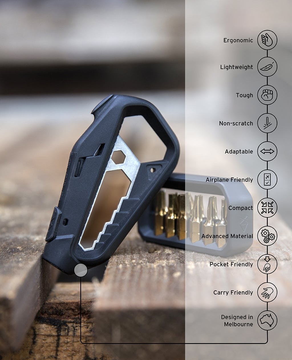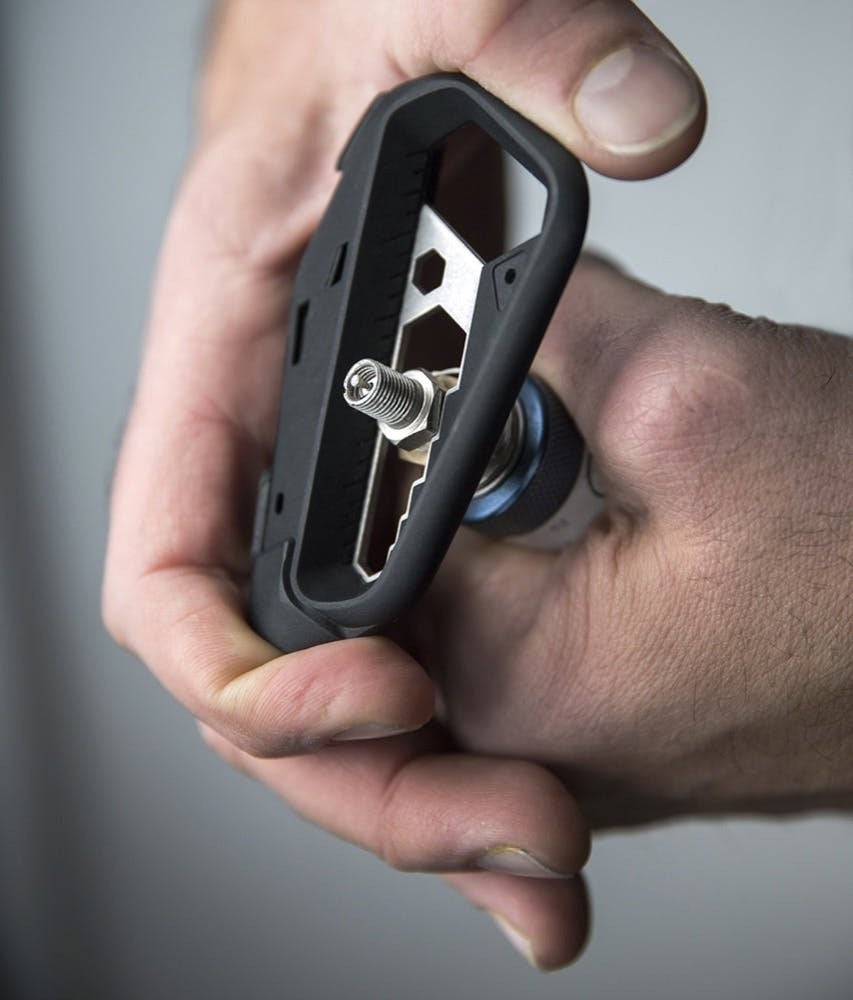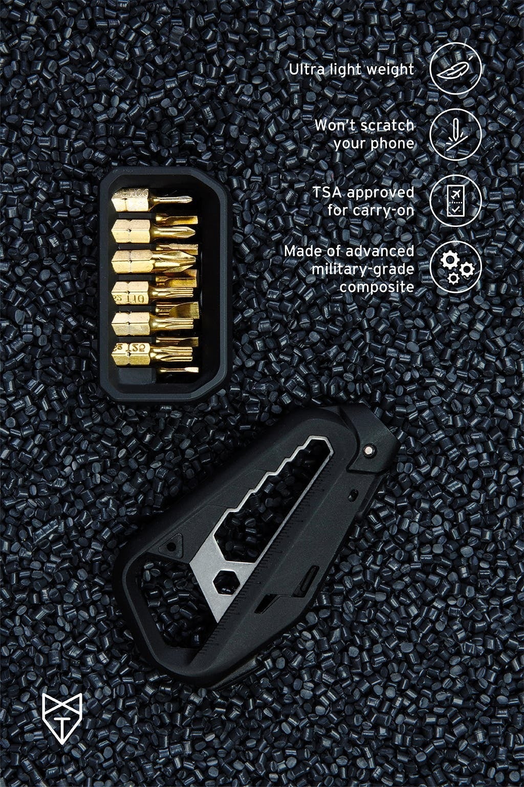 「M100.Xマルチツール」は、チタンより40%軽量で、スマートフォンに損傷を与えないエンジニアリンググレードの複合材料を使用しています。iPhoneやiPadのそばでも安心してお使いいただけます。