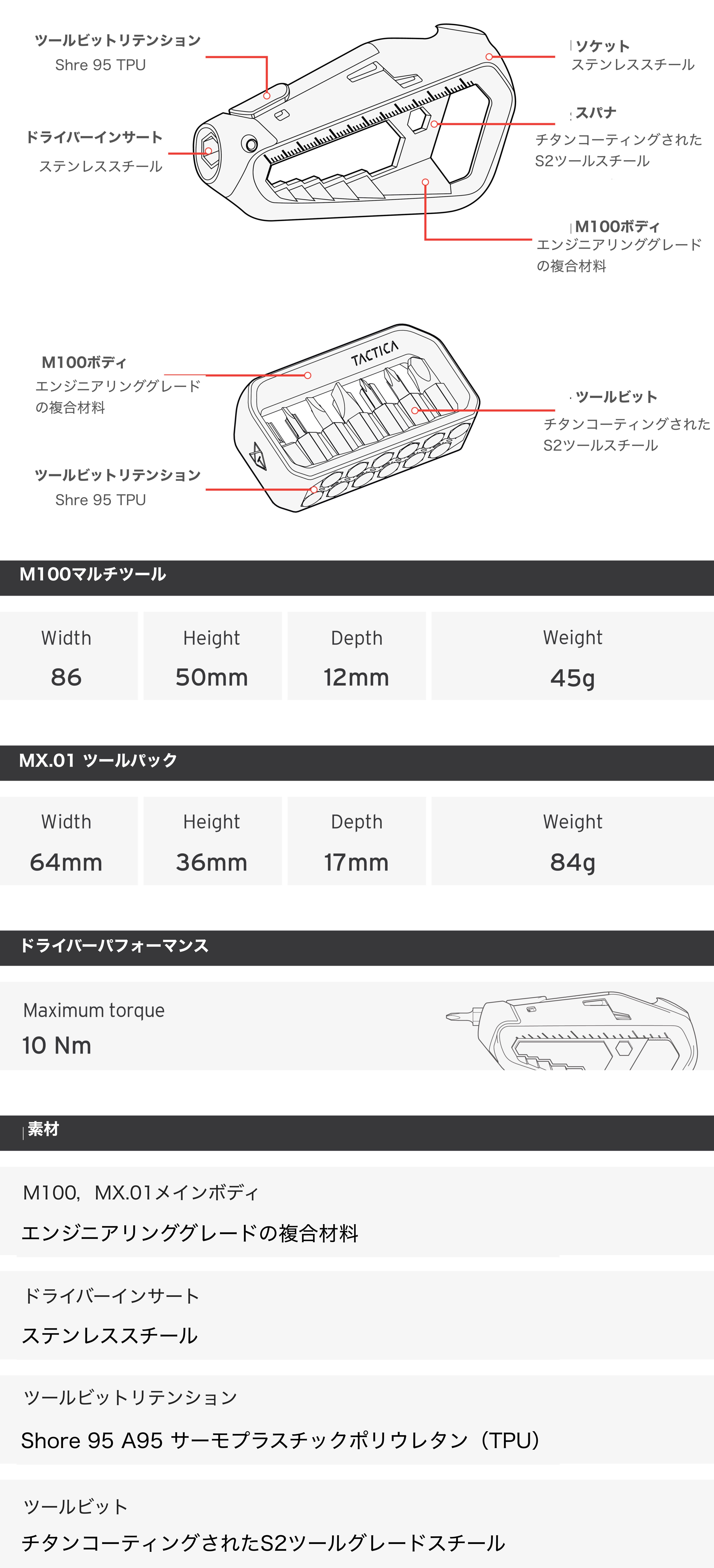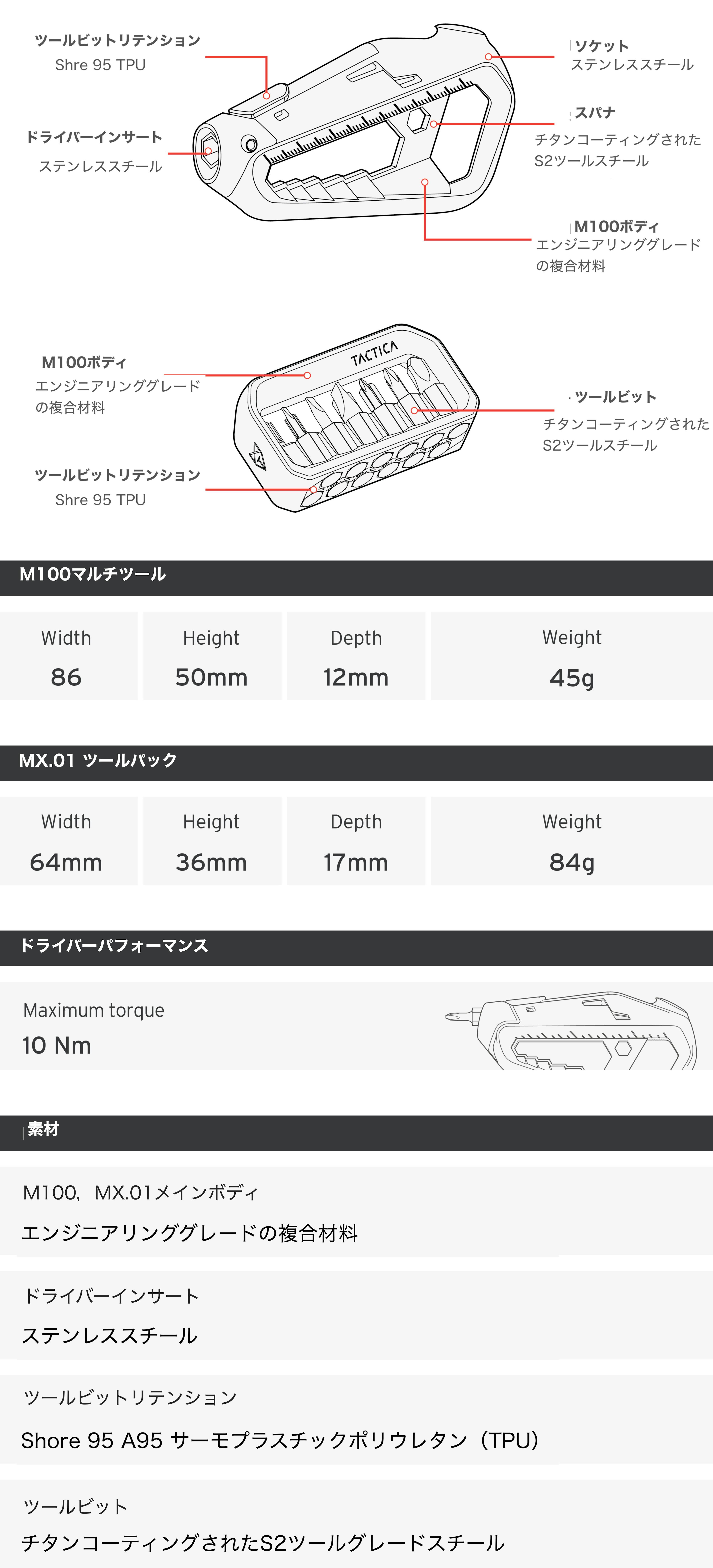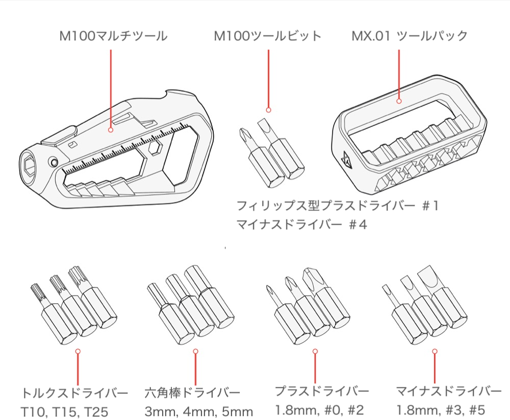 ドライバーやスパナなど、さまざまなツールをスマートフォンよりも小さいボディに収めた「M100.Xマルチツール」があれば、いつでもどこでも必要なツールをすばやく手にすることができます。