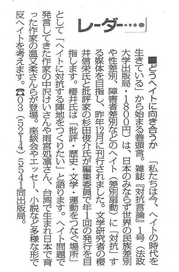 1)去る2020年1月29日(水)付の『沖縄タイムス』文化面、「焦点/争点」のコーナーの一部で、『対抗言論』を紹介していただきました。記事の見出しは「ヘイトとフェイクニュース 本物の「手触り」で対抗 紙の雑誌 速度の暴力へ起点」です。共同通信社による論壇時評記事で、今後も各地方紙に掲載されるため、紙面の内容はアップできませんが、以下に当該部分のみ引用させていただきます。「(略)そうした「ヘイト(憎悪)」に立ち向かう年1回刊の雑誌「対抗言論」が創刊された。「あらゆる表現はプロパガンダなのか?」で批評家藤田直哉は、右派が「日本」対「反日」という二項対立にこだわり「あらゆる表現を『プロパガンダ』だと受け取りやすい」と指摘。左派もフェミニズムや環境問題などで言葉による戦略を重視し、自らの価値観を広めてきた。 双方が自らの価値観を守る「戦士」となってプロパガンダ合戦が始まる。戦線は拡大を続け、真偽不明の情報が拡散するばかり。藤田は「本物や事実の『手触り』を回復させる」ことに希望を見ようとする。でもどうやって? (略)」2)2月2日(日)付『しんぶん赤旗』読書欄の「レーダー」でも、本誌をご紹介いただきました。ここに記事の画像をアップいたします。記者のみなさまに心より感謝です!