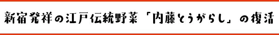 新宿発祥に江戸伝統野菜「内藤とうがらし」があります。この「内藤とうがらし」は、江戸時代、新宿一帯が一大産地でした。しかし、明治になり、都市化されたことにより、内藤とうがらしの存在が徐々に薄れ、絶滅してしまいました。