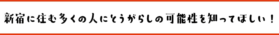 新宿の魅力は、大都市の顔だけではありません。江戸時代、新宿御苑の界隈を真っ赤に染めていた「内藤とうがらし」という温かなMade in SHINJUKUのものを起点とした体験は、この街に住む人たちの心をつなげ、そして、新たな新宿の魅力をもっと多くの人に知ってもらえるきっかけになっていくと信じています。