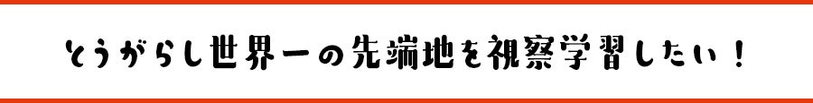 また、そのとうがらし祭りで、歴史、生産、加工、販売、イベント、広報を学習し、そこに住む人たちの想い、努力、誇りなど刺激を受け、住む場所の魅力を住む人たちが村の継続的な発展のためにつくりだす方法を持ち帰りたいです。