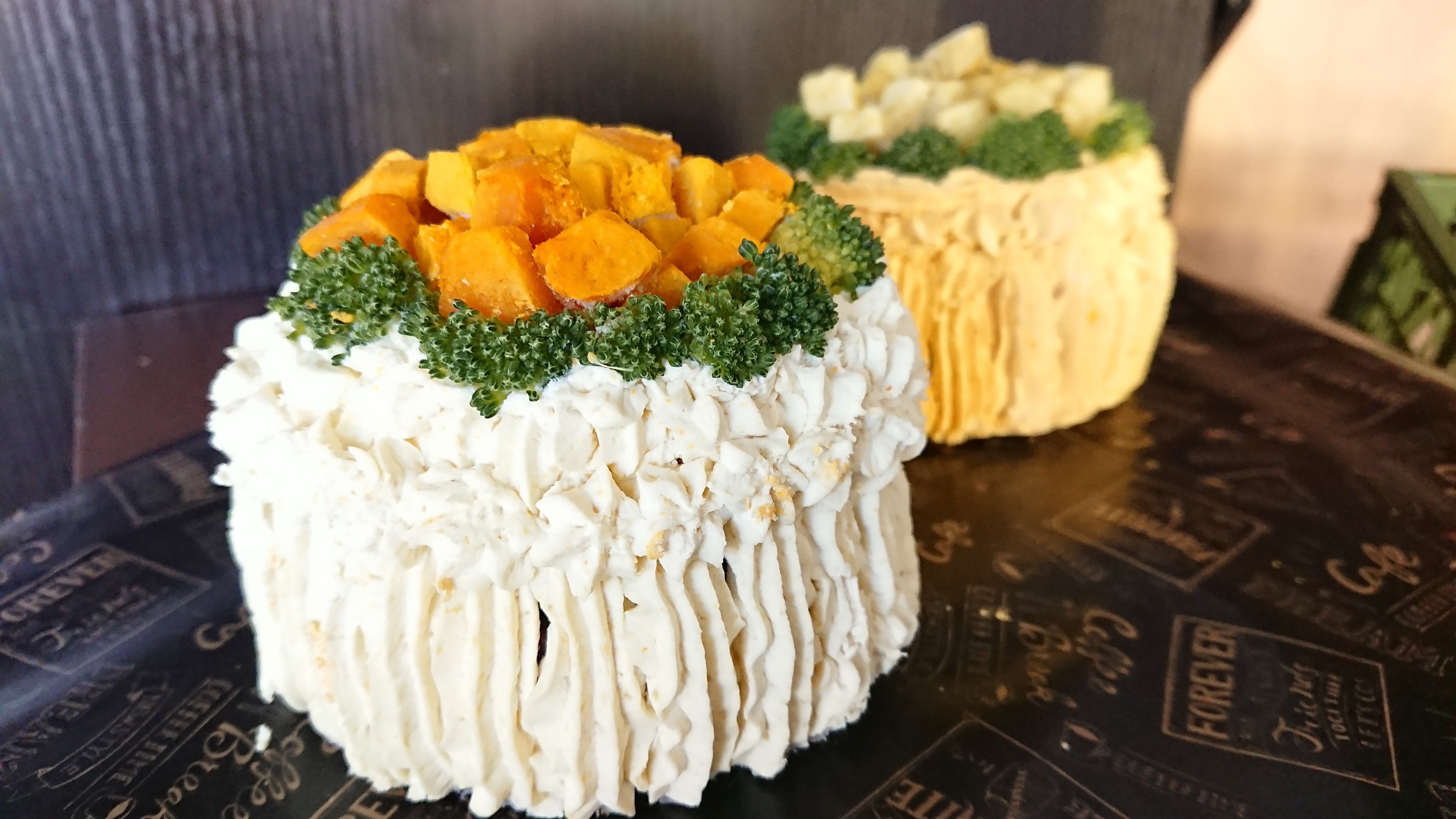 また、ワンちゃんのアレルギーや好きな食べ物などカウンセリングを行い、それぞれに合わせたお祝いケーキをお作りしております。こちらも、一つ一つ手作りのため、店頭のみの販売となっております。