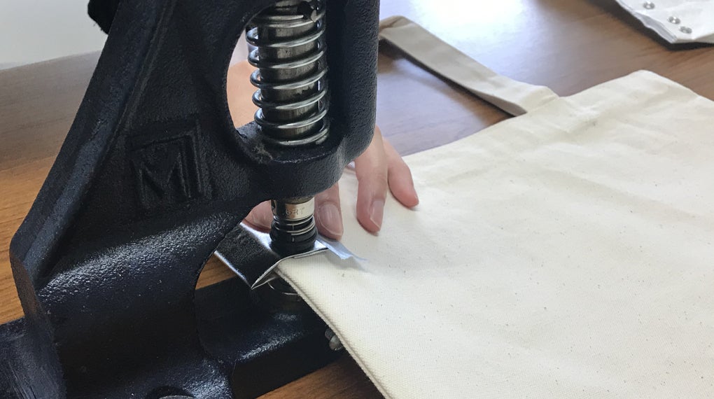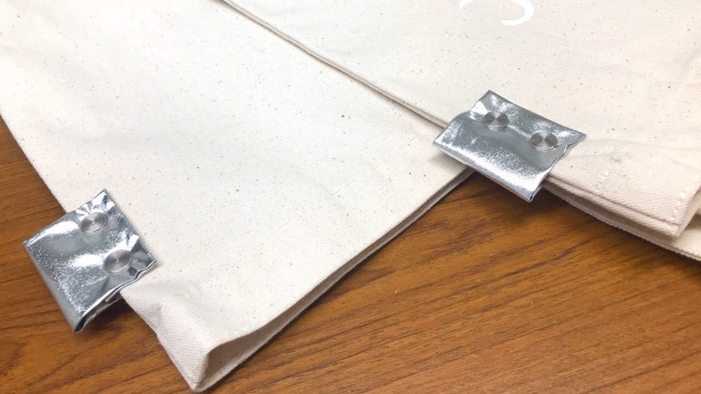 このトートバッグに付いている「シルバータグ」は、2つのビスで簡単に打ち付けることができます。こむぎさんの利用者さんのほぼ全員に、作業可能な仕事として提供することができるものです。