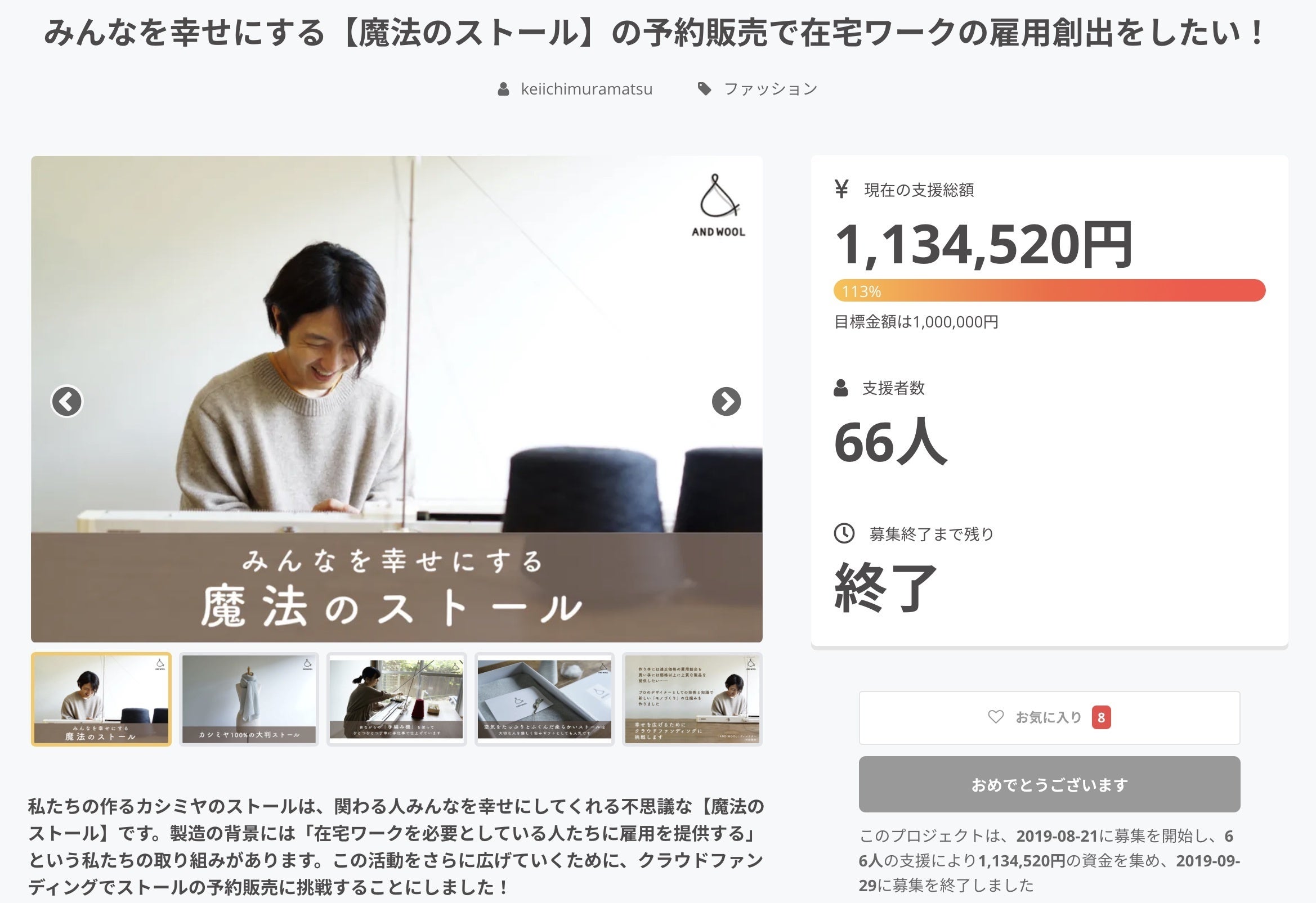 ・リターン品:詳細は改めてお知らせしますが、一番人気の「カシミヤ100%大判 魔法のストール」を中心に、この1年で就労支援事業所さんと開発した商品などをご用意する予定です。リターン品はすべて、手仕事により1点1点仕上げられたもので、雇用創出プロジェクトに参加して私たちの製品製造の担い手となってくださっている皆様に作っていただきます。