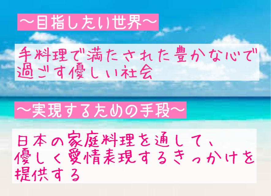 一番身近な愛情表現である「手料理」を通して、人と人を繋ぎ、そして日本と世界を繋げることで、インターネット社会で希薄になりがちな心の繋がりを持ち続け、優しい社会を未来に繋ぎ続けられればいいなと考えています。