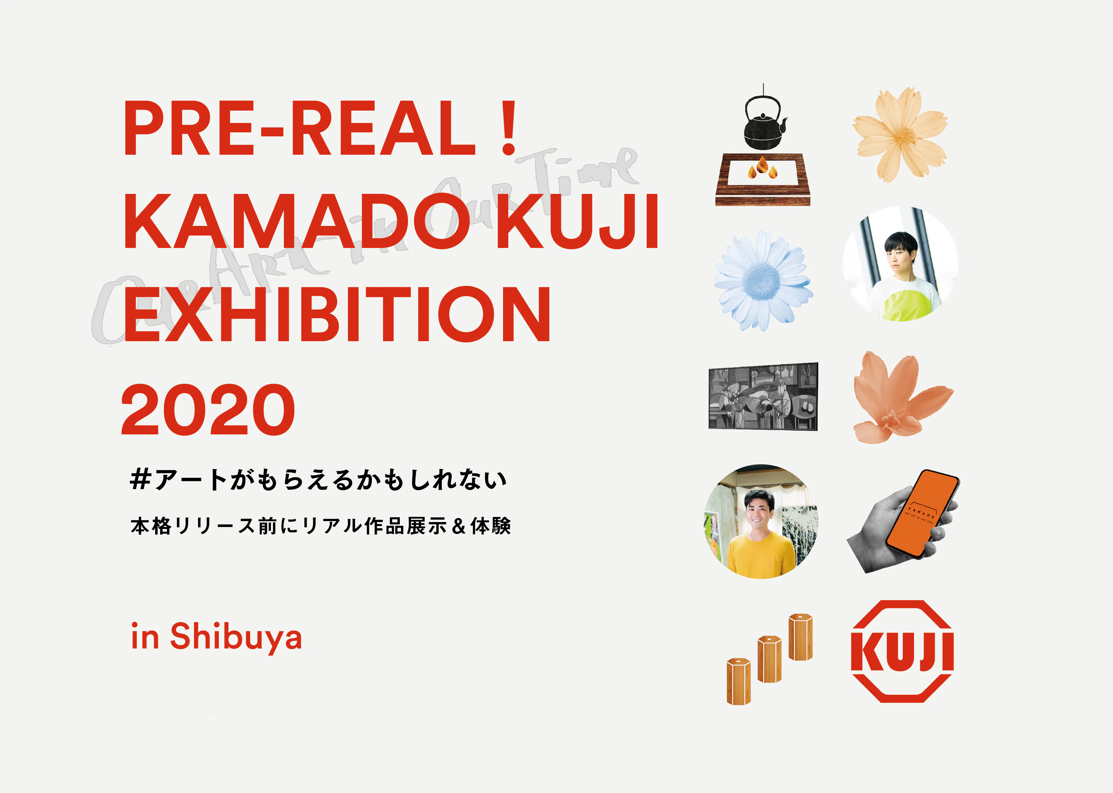4月中旬〜下旬の期間内の数日(*)、KAMADOがローンチする「すこしのお金でアートがもらえるかもしれないKUJI」のオンラインサービスについてのプロトタイプ展並びに、KUJI作品に参加してくれる現代アーティストの作品展示「PRE-REAL! KAMADO KUJI」を開催します。(*2日程度で実施する為、調整中)