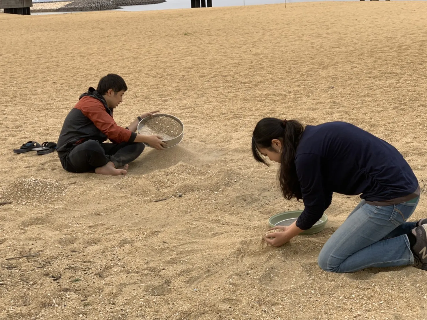 この写真は選手の方々が足をけがしないように、砂をふるいにかけて大きな石やビンの破片などを取り除いている時の写真です。