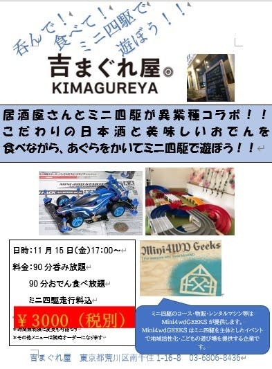 この度、Mini4wd GEEKSは、東京都荒川区にある居酒屋”吉まぐれ屋”の2階にてミニ四駆専門店・サーキット場を開店することになりました!緊急事態宣言下で東京都の要請に従いながら、先ずは5月24日(日)からプレオープンいたしますが、緊急事態宣言が解除された後、皆様には、グランドオープンキャンペーンといたしまして限定回数券やパスポート、無料入場券などをご購入いただくことにより、Mini4wd GEEKS三ノ輪橋駅前店が良いスタートダッシュを切り、こどもから大人まで末永く皆様に楽しんでいただける店舗運営に協力していただきたく存じます!!