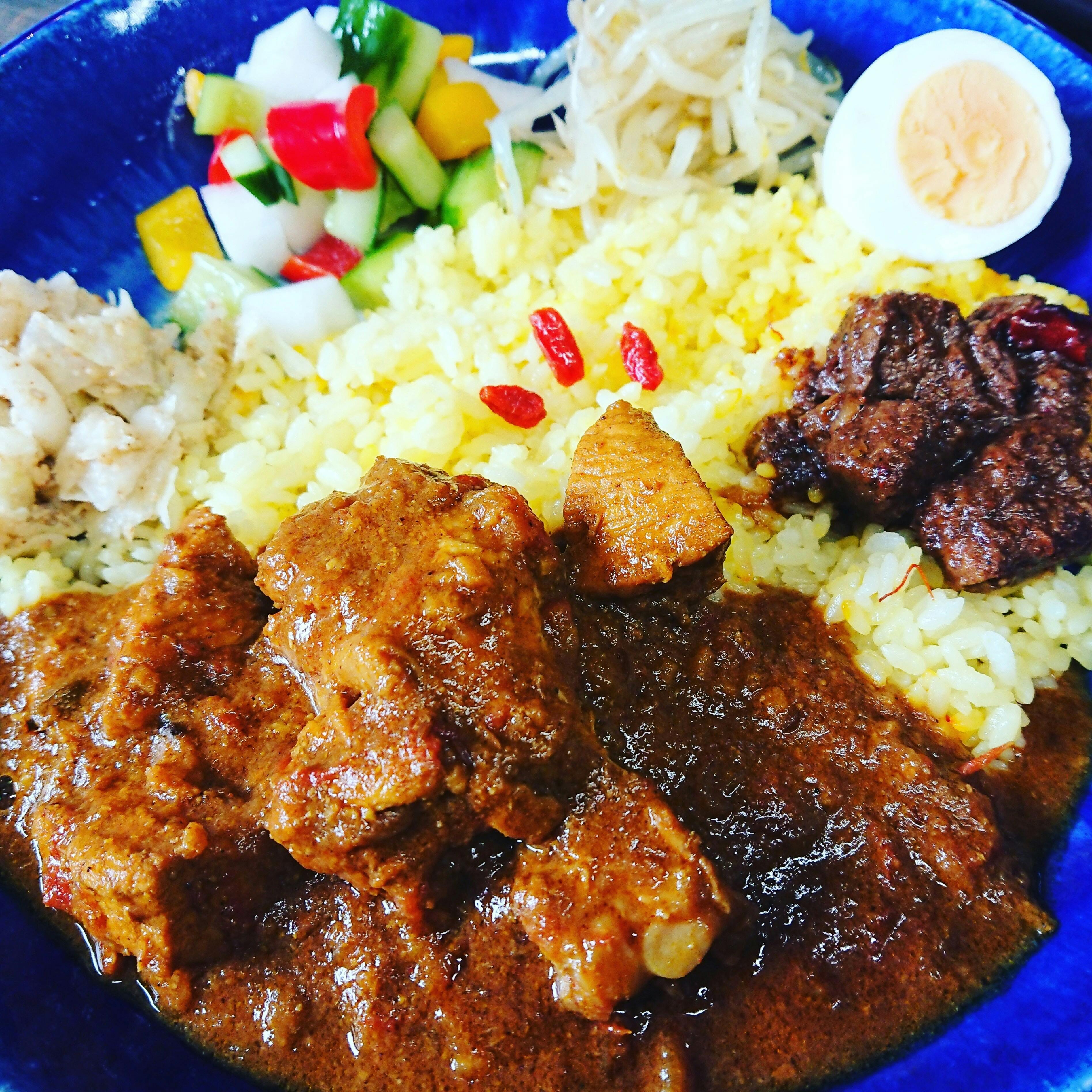 地元鶴ヶ島で作っている鶴ヶ島サフランの魅力を皆様に知っていただきたいという思いもあり、鶴ヶ島では鶴ヶ島産サフランのサフランライスとカレーを合わせてお出ししています。