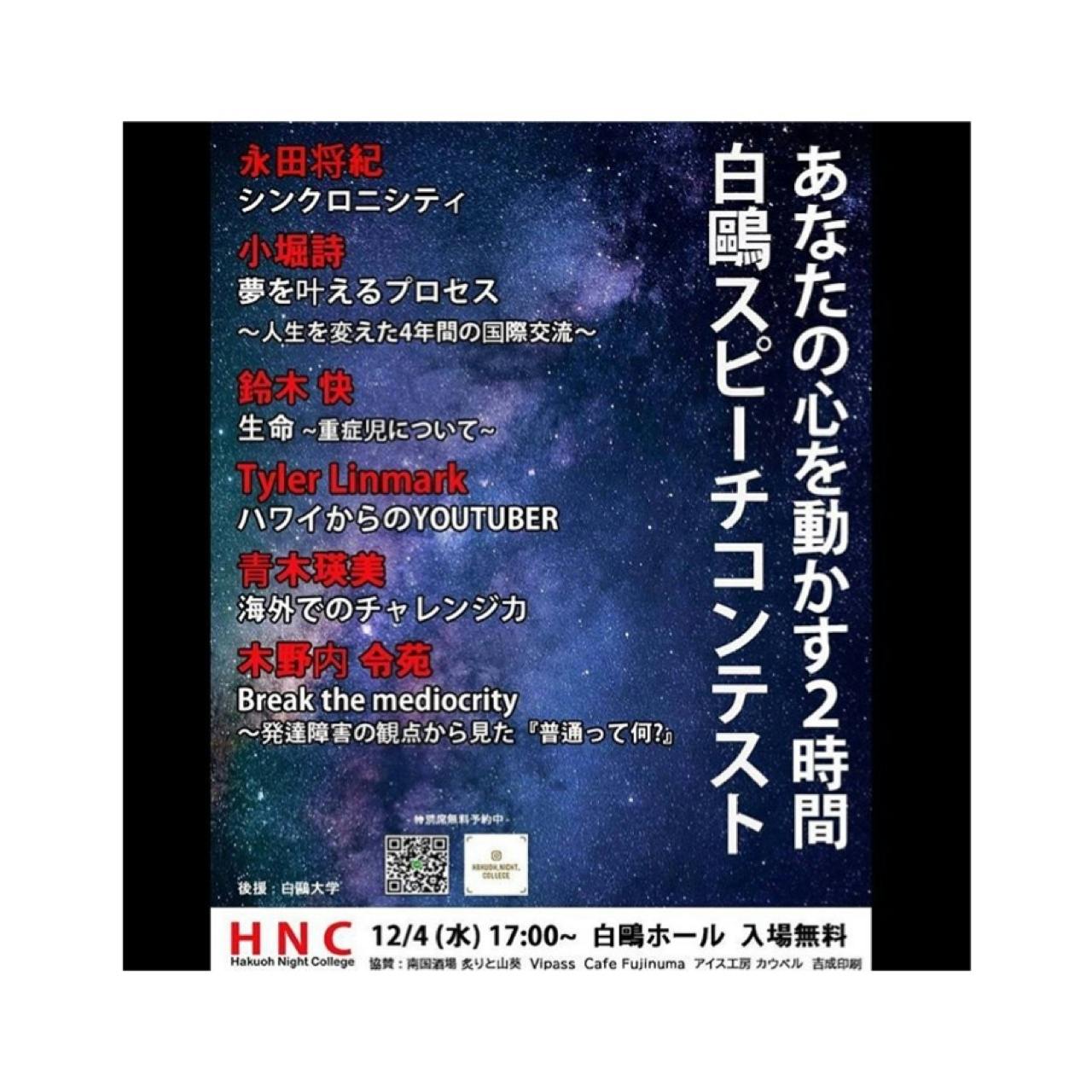 はじめまして。HNCです。HNCの正式名称はHakuoh Night college です。活動は白鷗大学で行っております。自分の想い、伝えたいことをスピーチにして発表するために結成されたチームです。