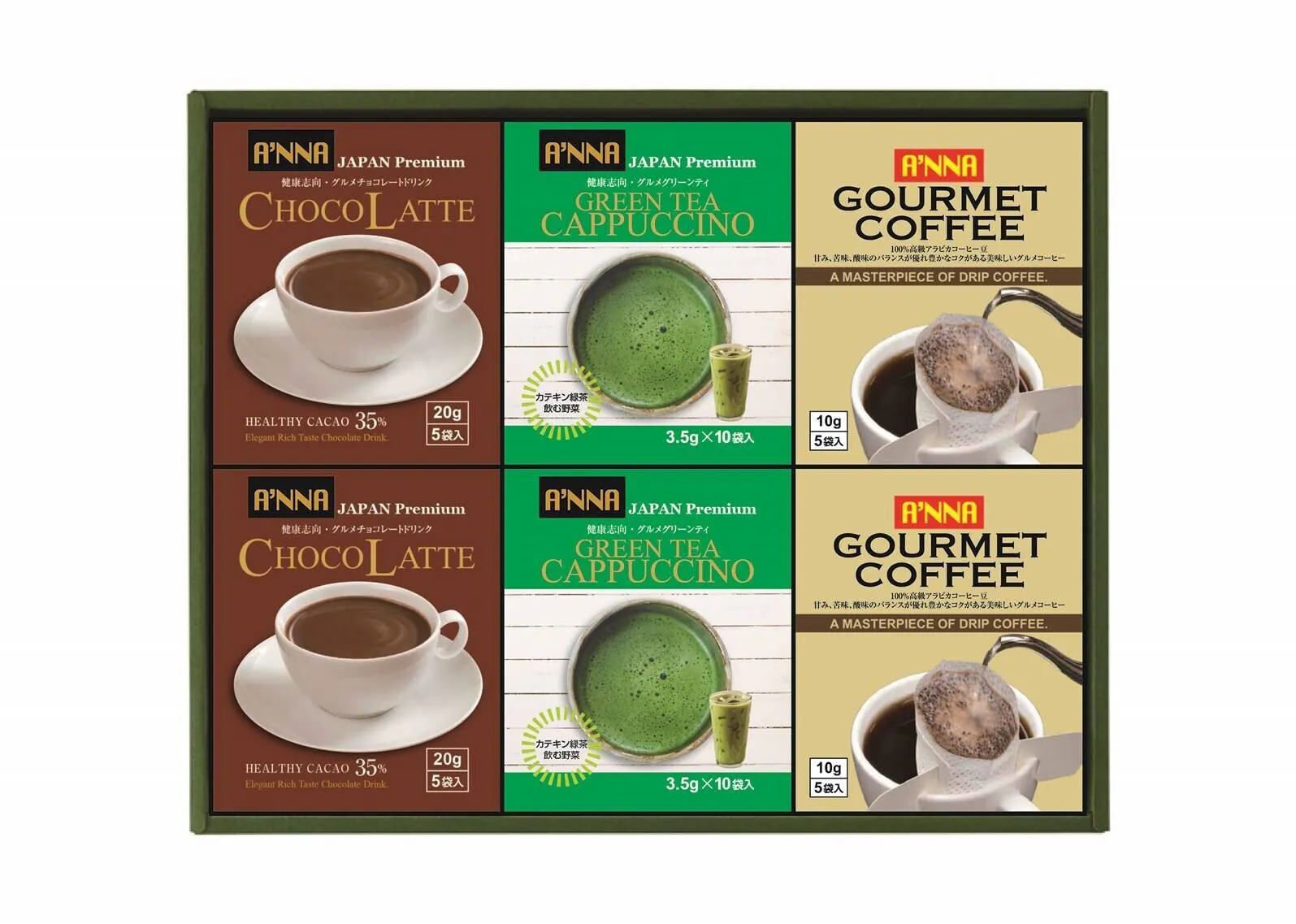 現在、ギフト品として販売しておりますホットチョコレートとティカプチーノとの詰め合わせの一例でございます。 1,000円から5,000円までの詰め合わせギフトとして、ギフトショップを通じて販売しております。 ギフト商品としては、他にないものでご好評をいただいております。 販売いただけるギフトショップを拡大すべく健闘中です。