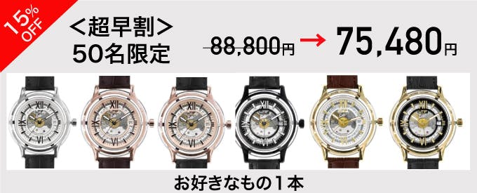 以下のとおり、通常であれば数十万円は下らないであろうこの時計が今回のキャンペーンでは7万円代よりお求めいただけます。