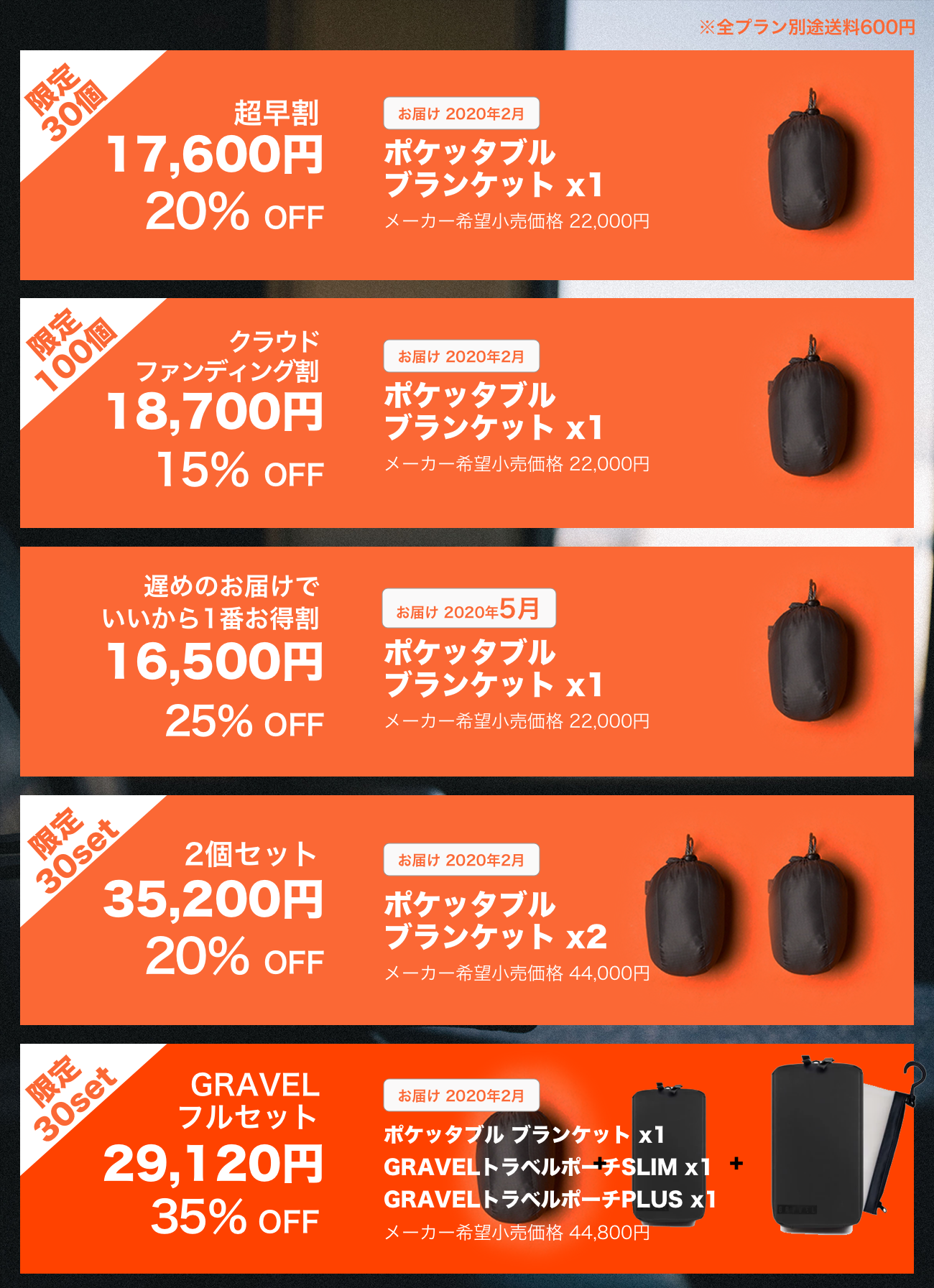 2020/04/27 11:16GRAVELポケッタブルブランケットをご支援いただいたみなさま、下記の5月お届けプランをご支援いただきましたみなさまに、発送の日付が決まりましたのでご連絡させていただきます。・GRAVELポケッタブルブランケット1個 一般販売予定価格:22,000円(税込)の25%OFF5/1(金)に発送するため、住所変更などございましたらお手数ですが4/29(水)までに住所変更の手続きをお願いいたします。【住所変更する方法】マイページでリターンの発送先住所を変更する方法https://mag.camp-fire.jp/6863/※ 宛先不明などで戻ってきてしまった場合、再度お送りするのに時間がかかってしまいますので、必ずお手元にお届けできる住所であることをご確認ください。3月に発送させていただきましたみなさま、発送の追跡上は全てお受け取りになられているかと思いますが、万が一製品に不具合などございましたらお申し付けください。イノベ部サポートセンター info@hands-aid.jpGRAVELはまだまだ若いブランドのため、よろしければAMAZONの販売サイトにてレビューをいただければ幸いです。(その場合「CAMPFIREで購入」と記載いただければ幸いです)よろしくお願いいたします。--------イノベ部 チーム一同 もっと見る【発送のご連絡】2月お届けのプランは3/5(木)に発送いたします