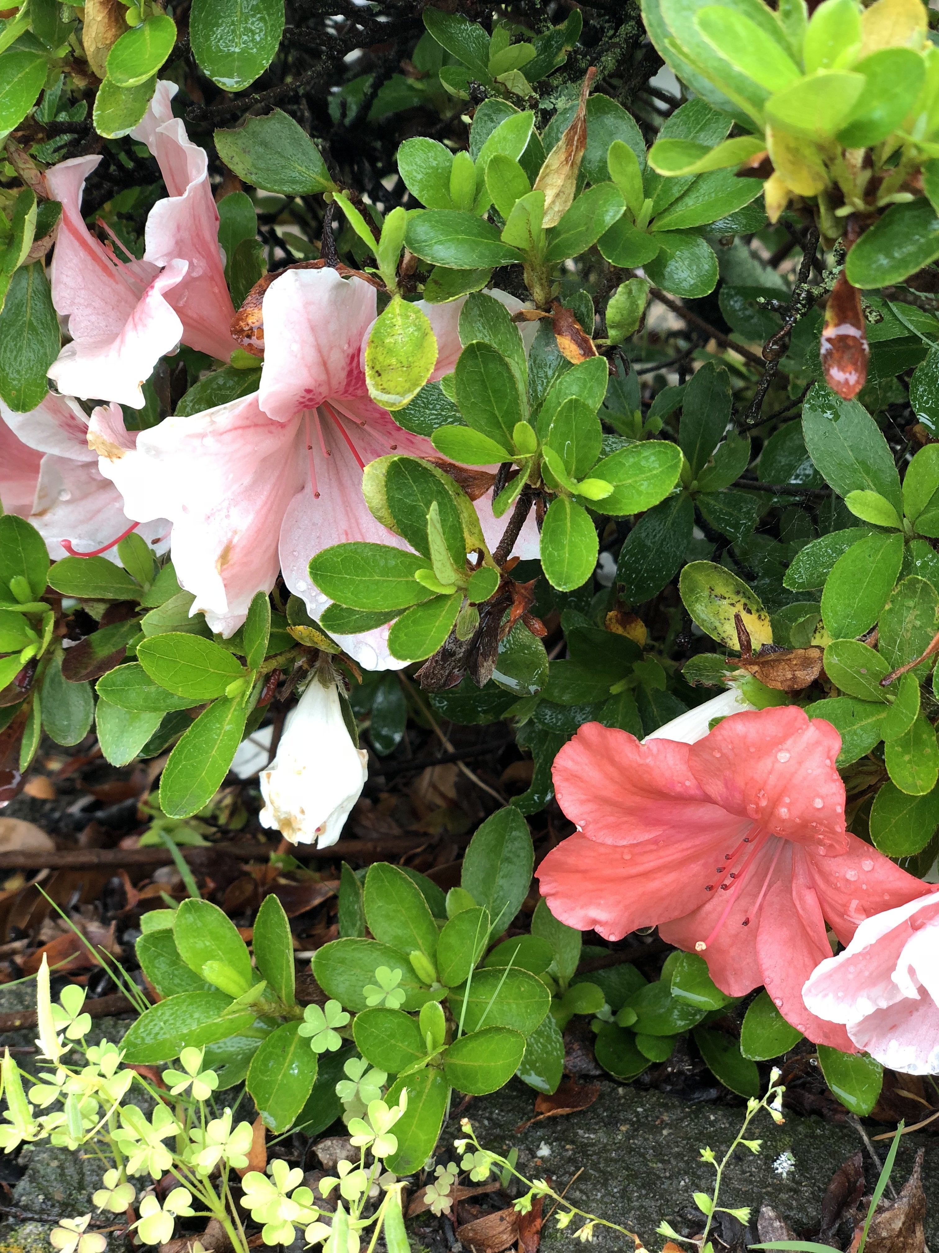 雨に打たれたさつきたちも美しい色を付けていました。手入れをして来年には満開にしたいです。