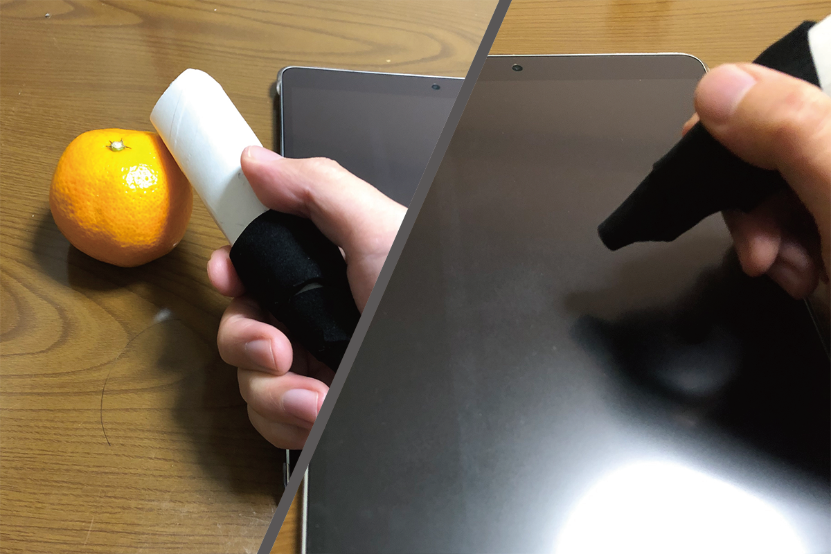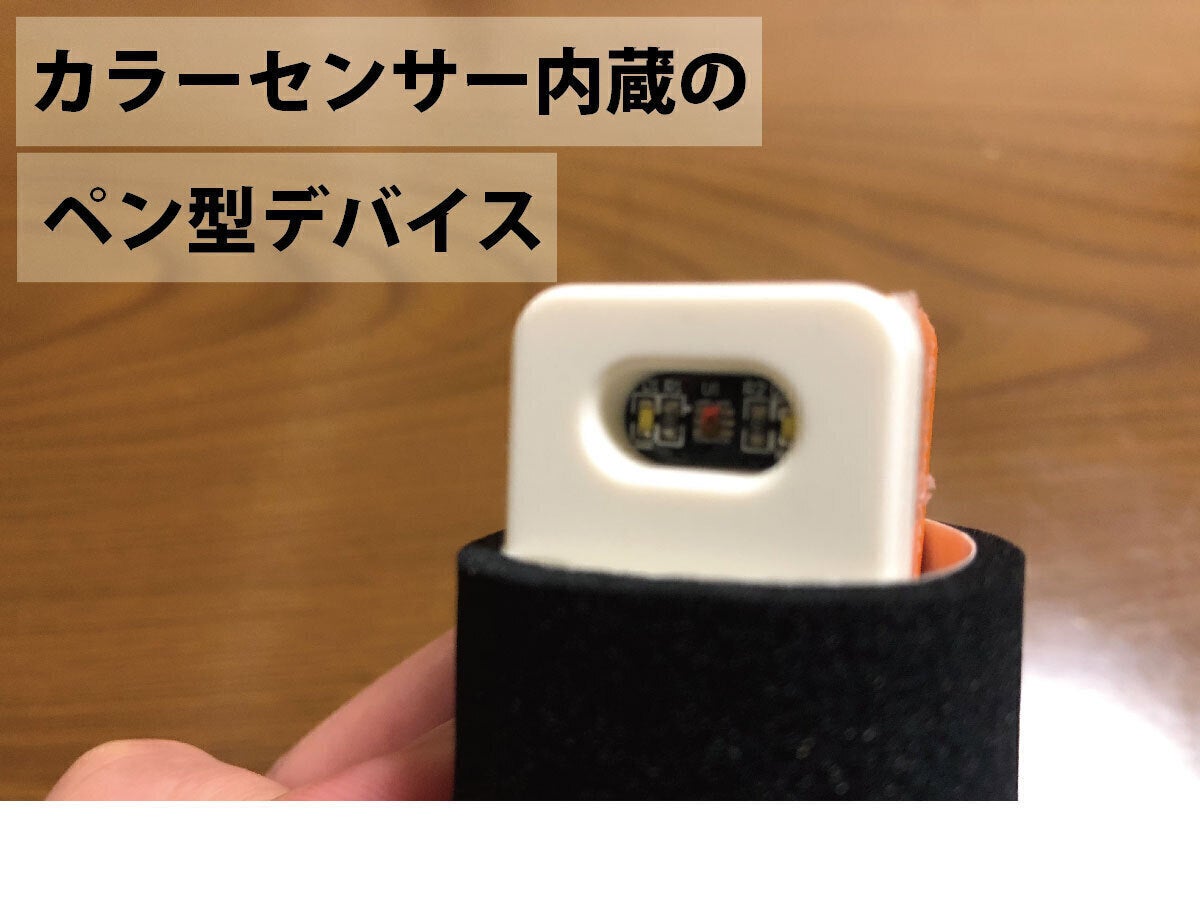 リンゴの色をぬりたい時は、実際のリンゴを探し、専用ペンデバイスでそのリンゴにタッチし、そのままそのペンでタブレットなどでお描きが可能です。