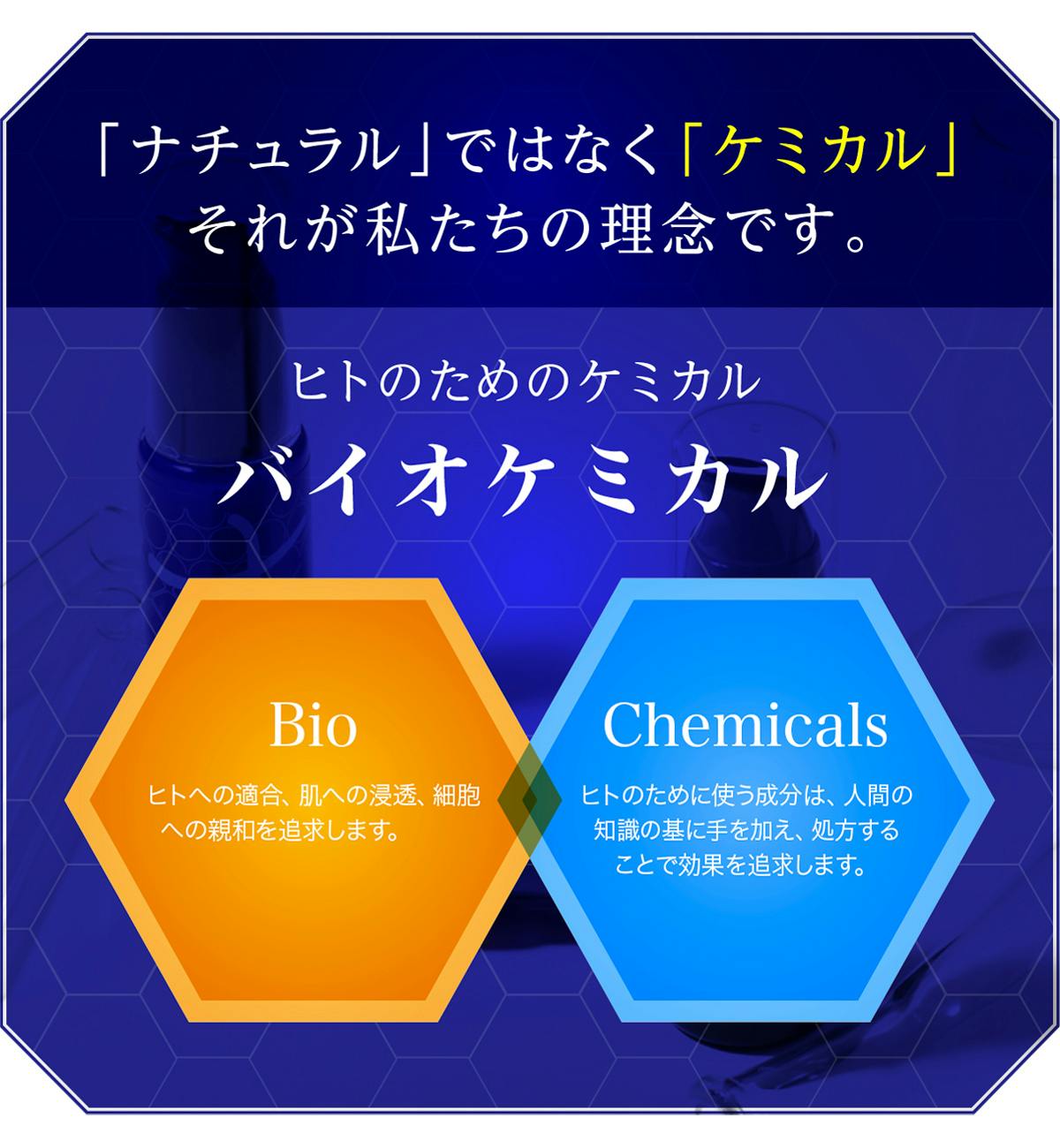 私達は、バイオケミカルを応用すればこそ、「薬効無き良薬」を名乗ることのできる化粧品を世に生み出すことができると確信しています。