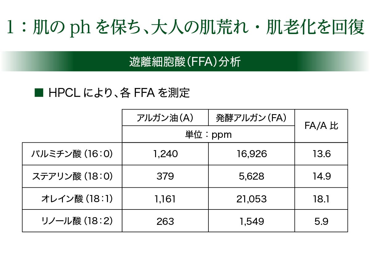 これらを単に素材のままの油分として処方するのではなく、発酵技術を応用することで、遊離脂肪酸が増加し、表皮の若返りを促します。