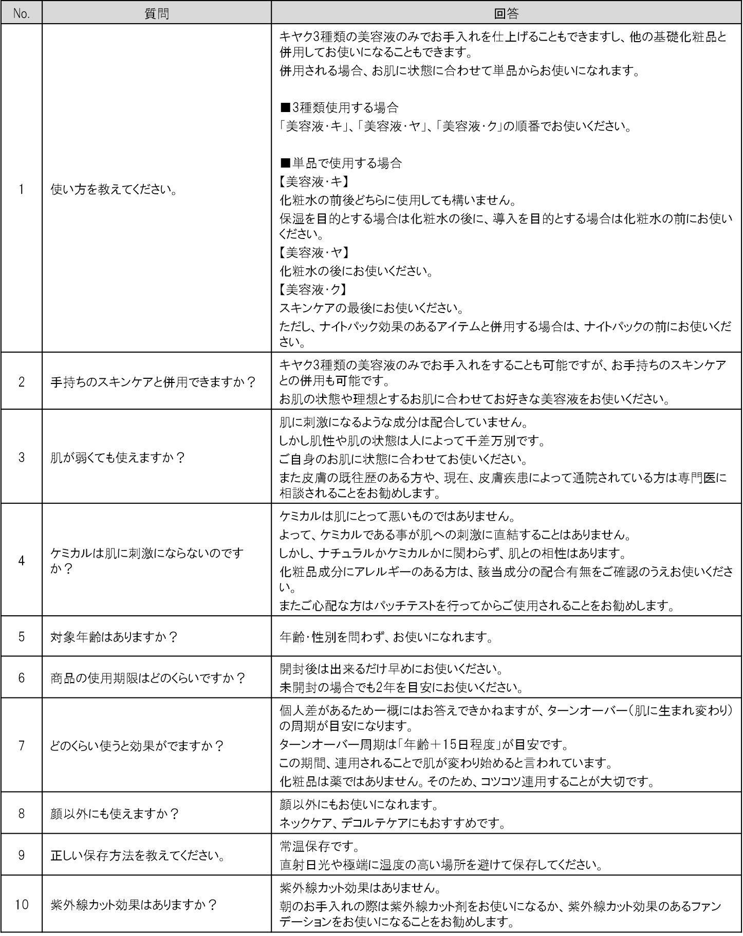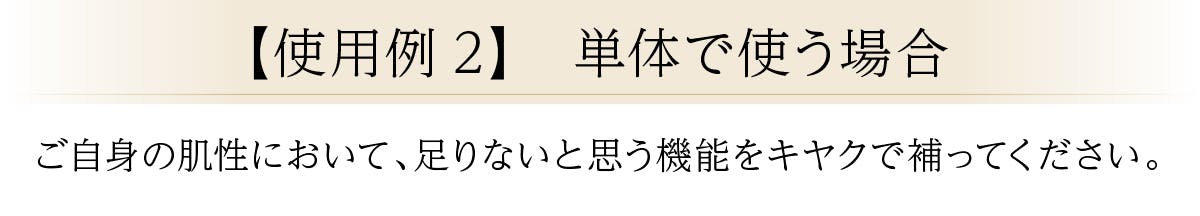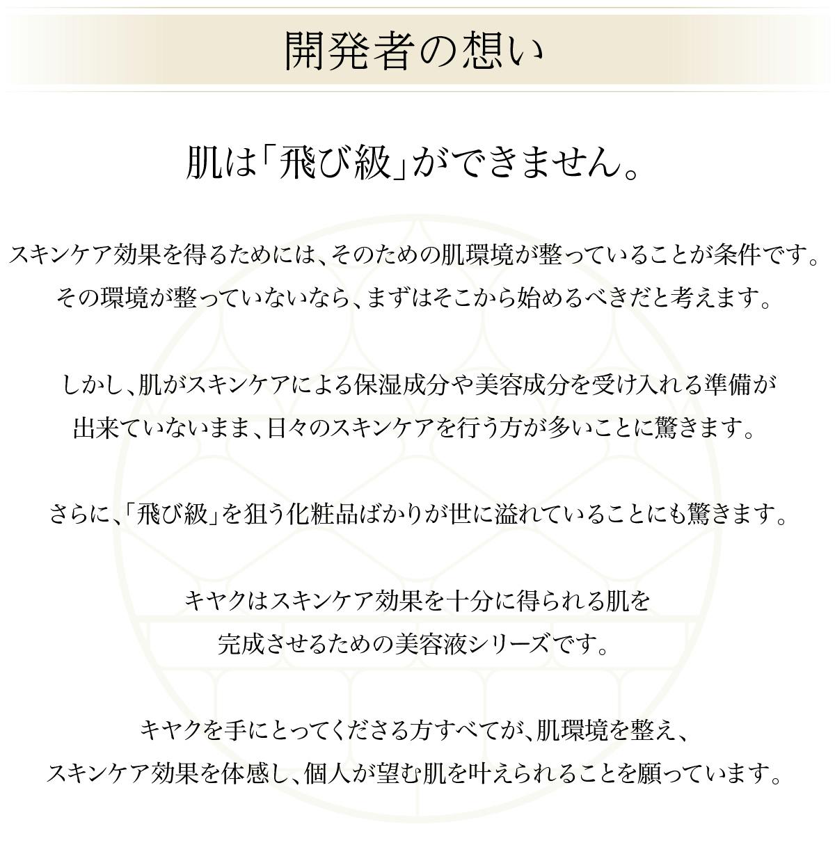 お手持ちのアイテムと併用する場合は、キヤク3種は化粧水で肌を整えた後にお使いください。