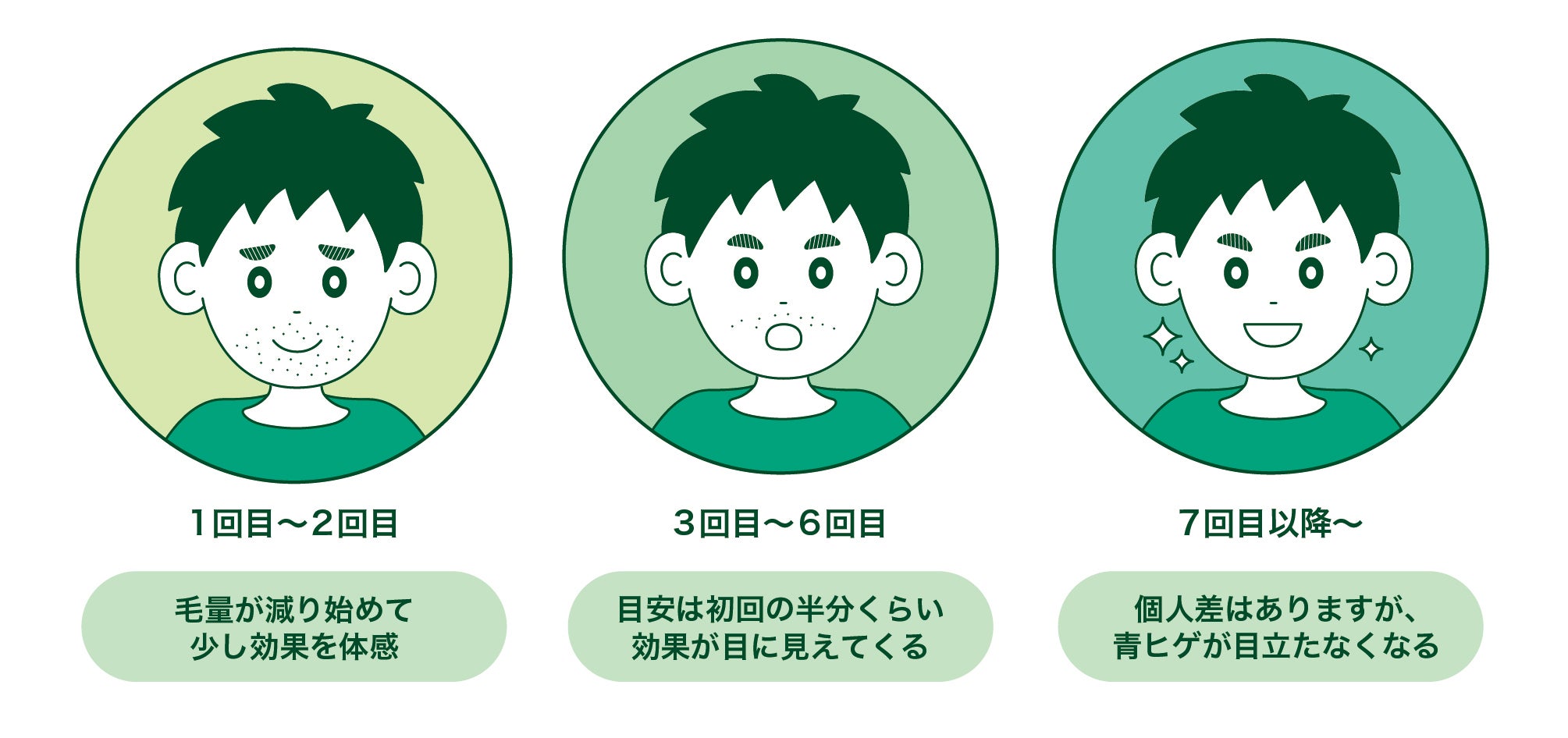毛の濃さや部位によっても差があるので一概には言えませんが、定期的に通うことで徐々に効果を実感できます。個人的に実感したのは5〜6回くらいからです。(あご下は5回でほぼ無くなりました。)