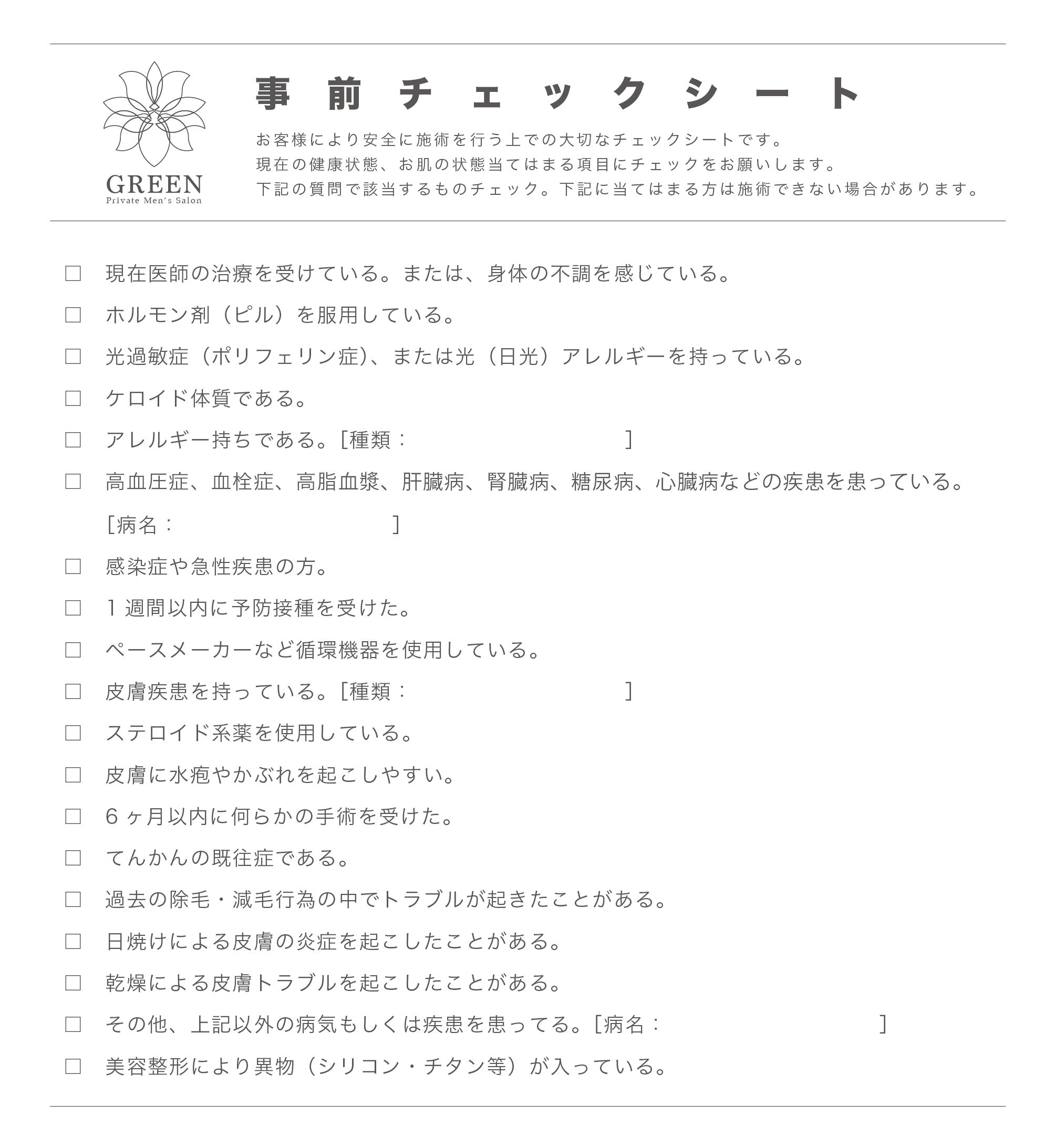 以下のシートにて当てはまる項目がありましたらチェックをお願いします。