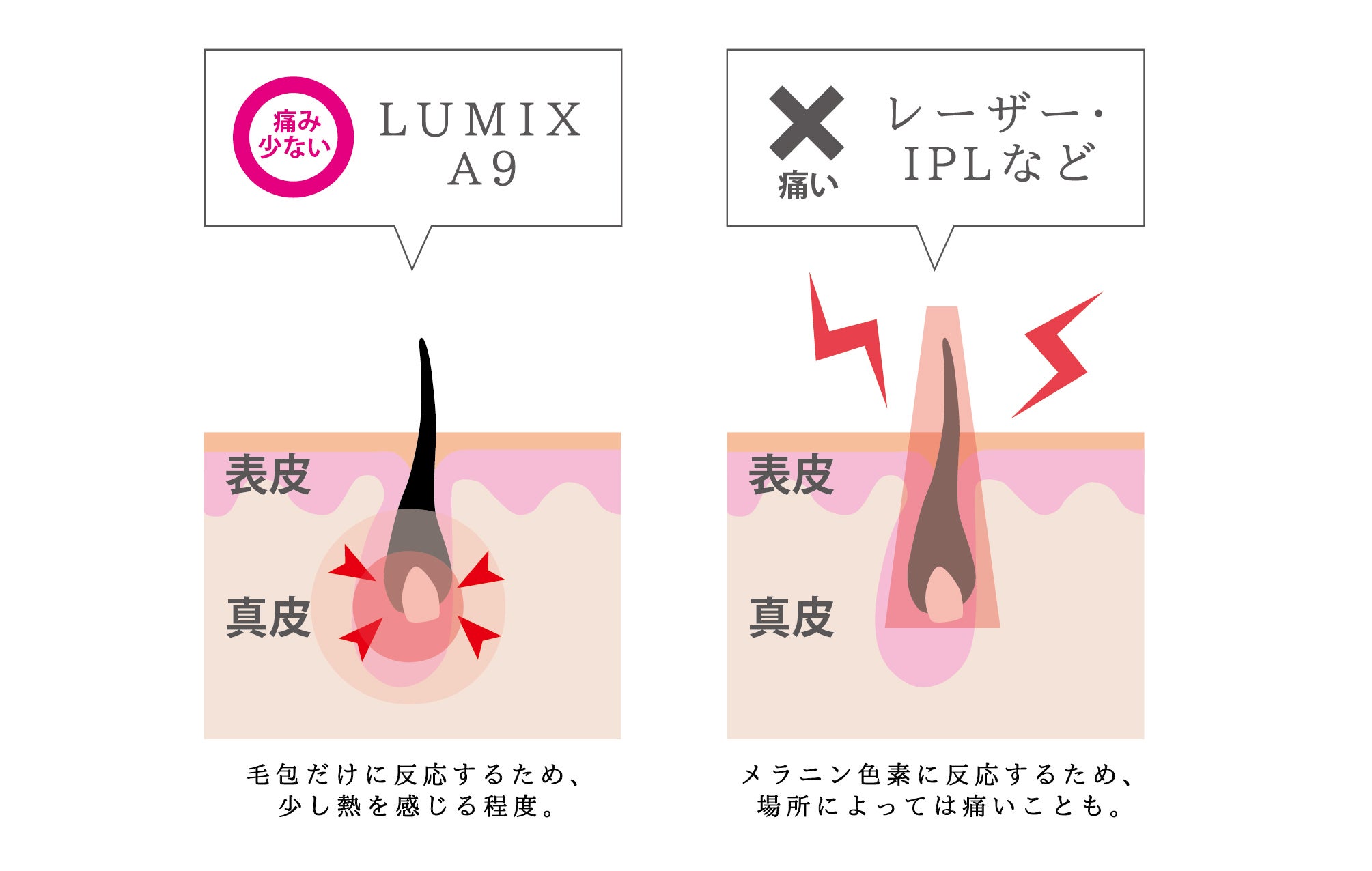 ルミクスA9は毛包だけに反応するため、お肌へのダメージがほとんどありません。