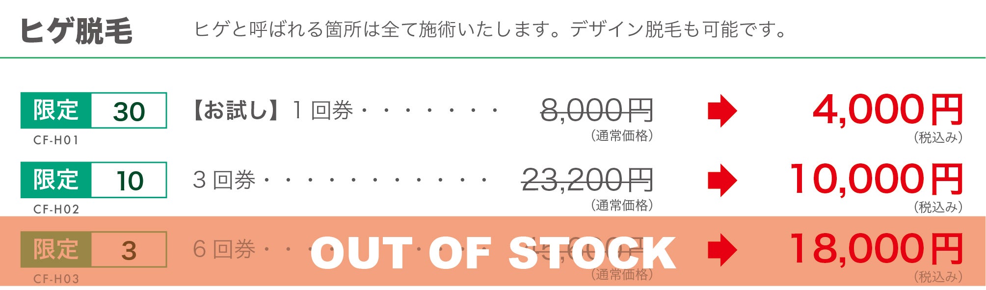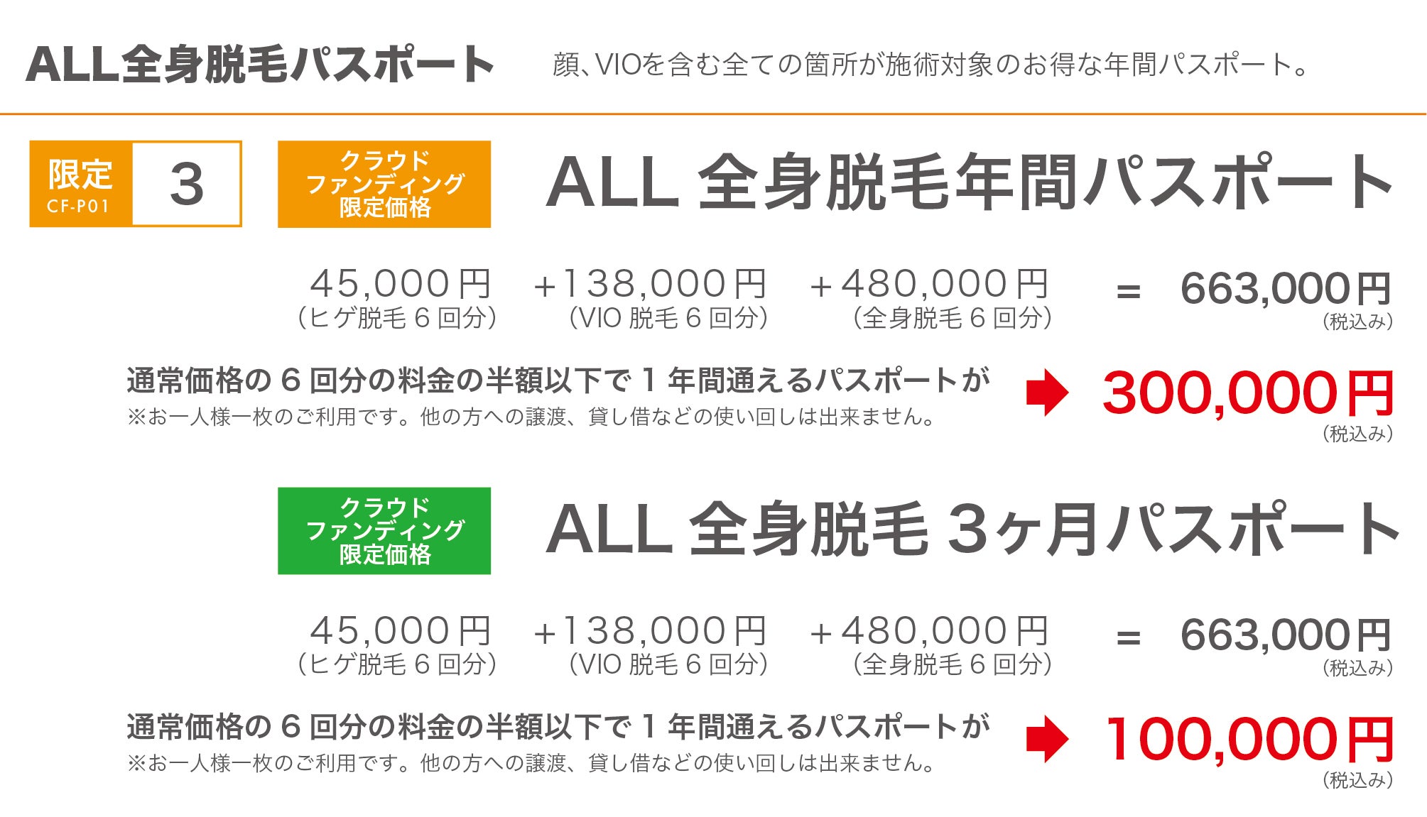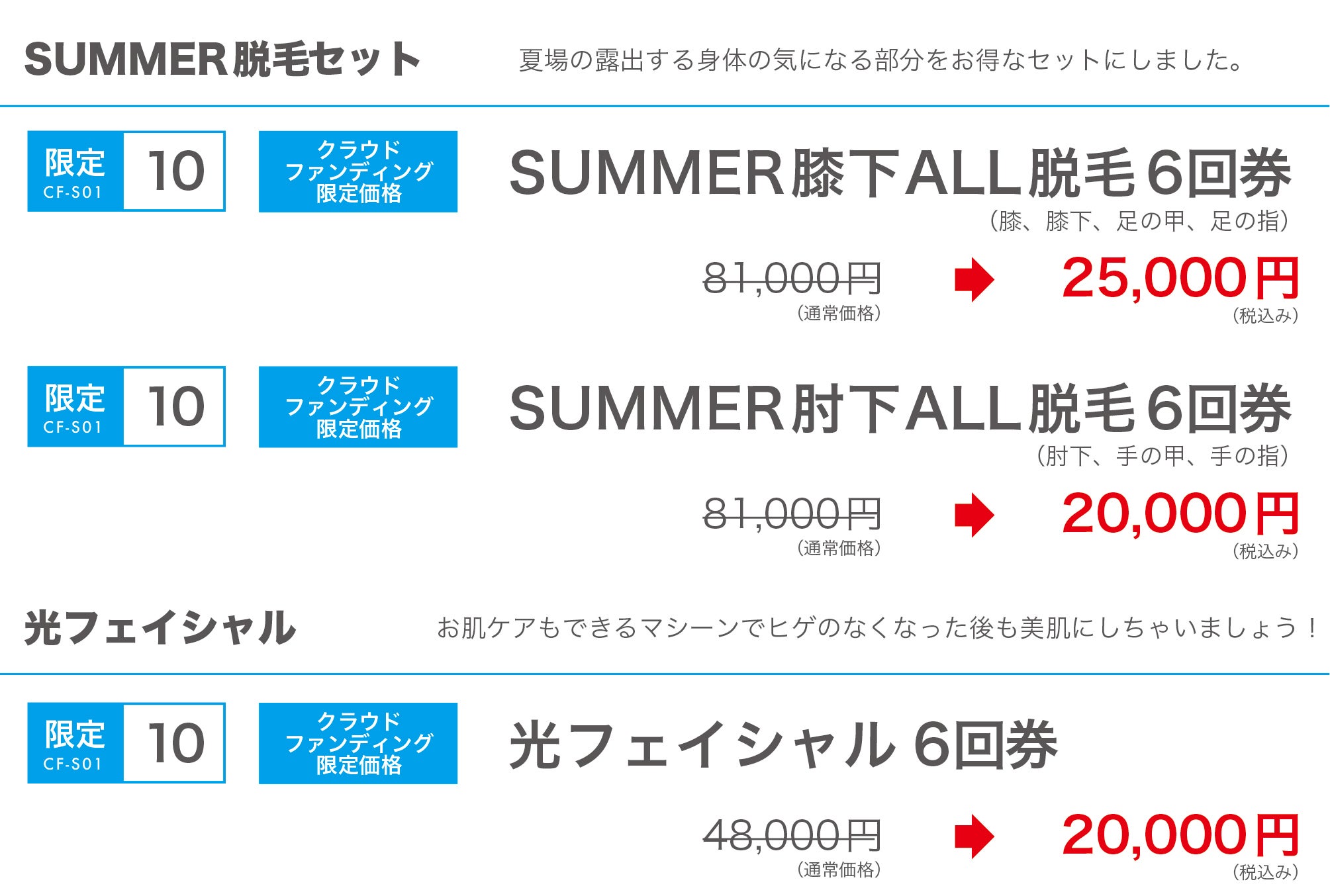 ※限定数に達したリターンに関しましては別のプランにて新たに追加する場合があります。※メッセージにてリターンのご要望などがありましたらできる範囲でお応えいたします。※脱毛メニュー通常料金と内容詳細は下記の料金一覧をご覧ください。
