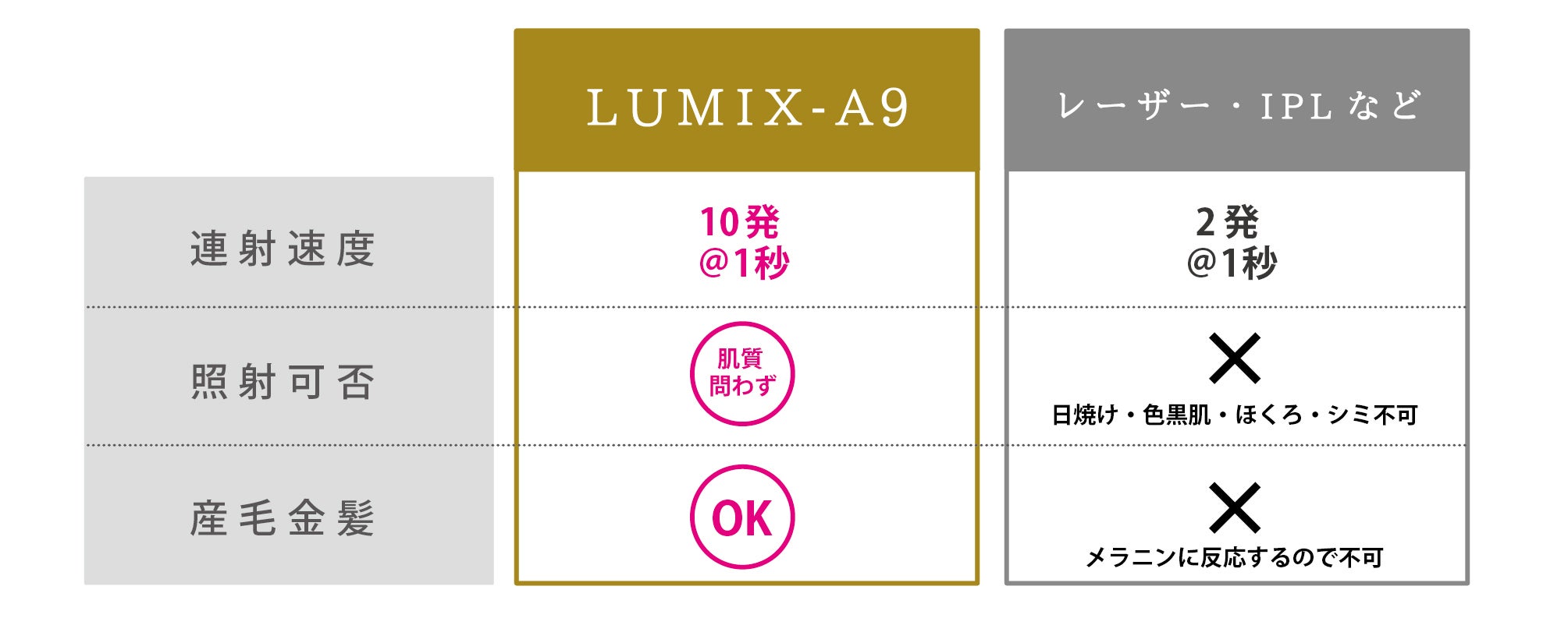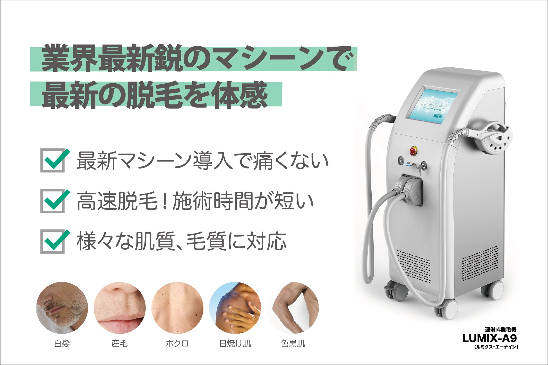 ルミクスA9は、レーザーやIPLなどの他の脱毛機器と比較してもその連射速度は群を抜いており、1秒間に10発もの照射が可能となっております。今まで毛周期を考慮して2〜3ヶ月の期間をあけないと照射できなかったのが、1ヶ月おきに可能になるため、施術のスピードも含め、施術完了期間も短縮できるようになりました。