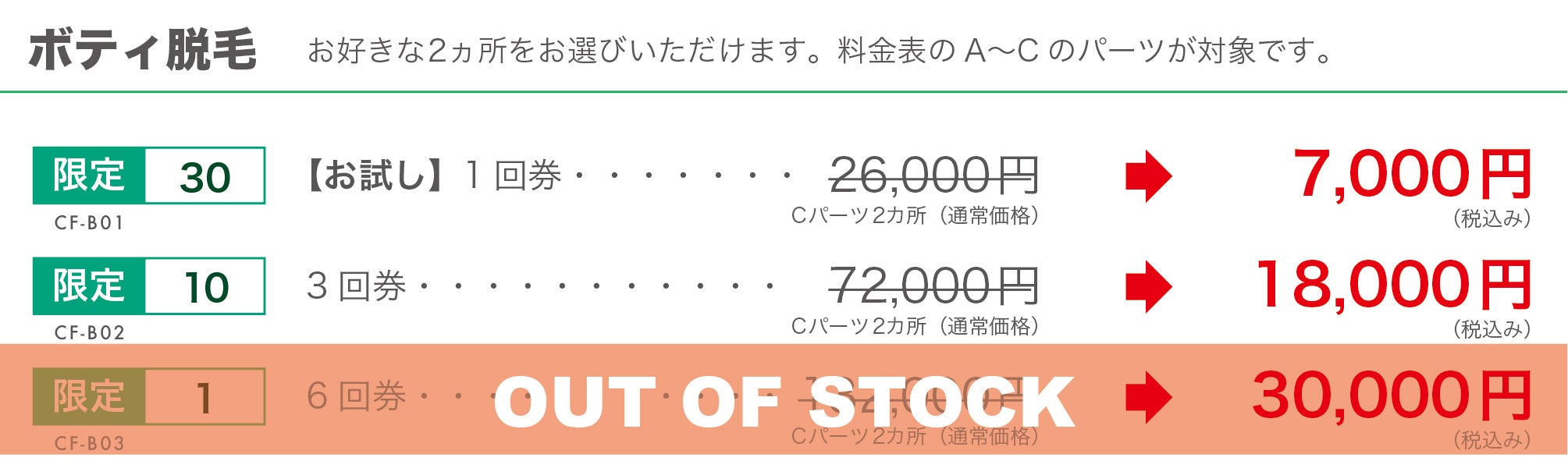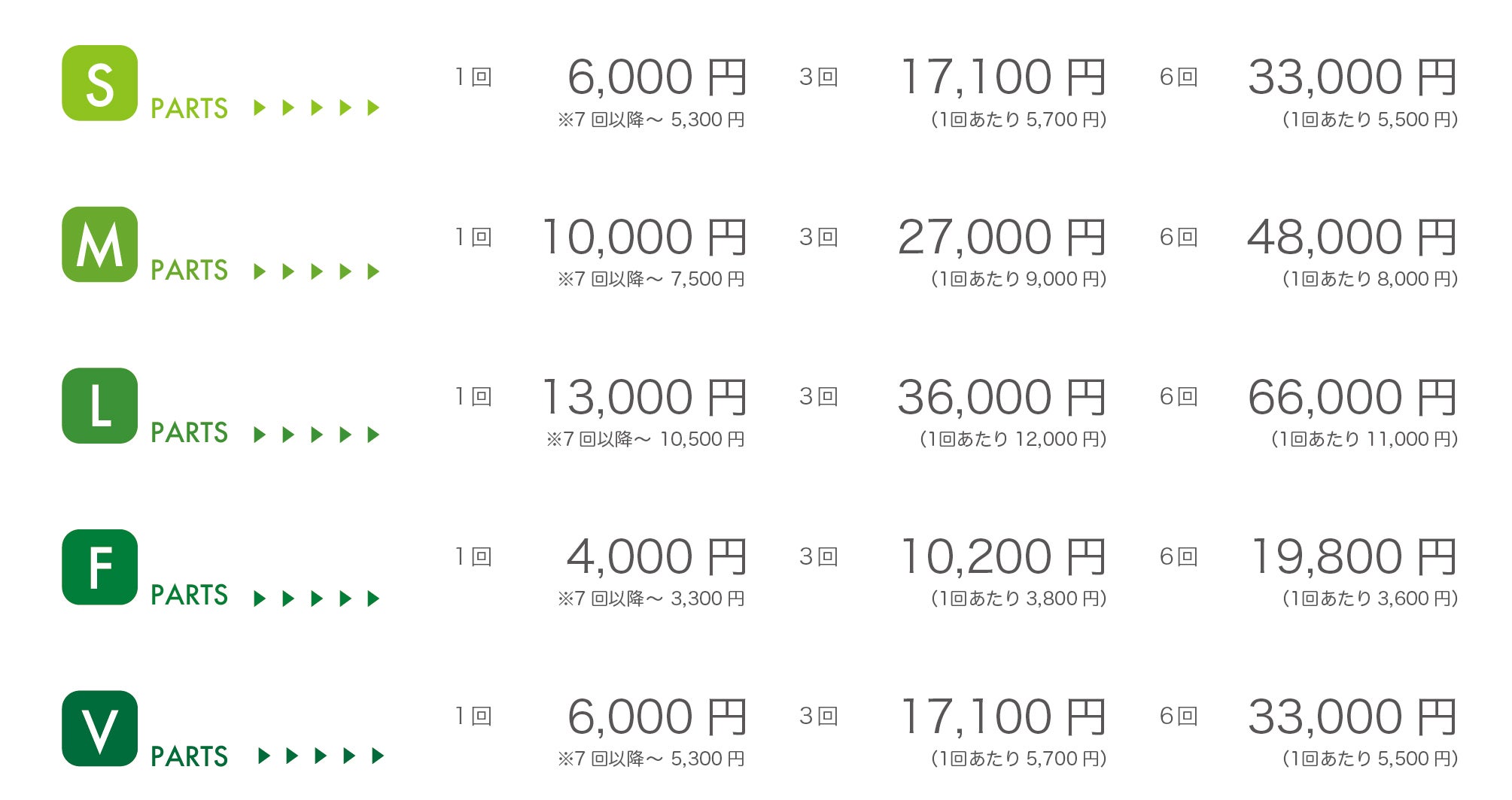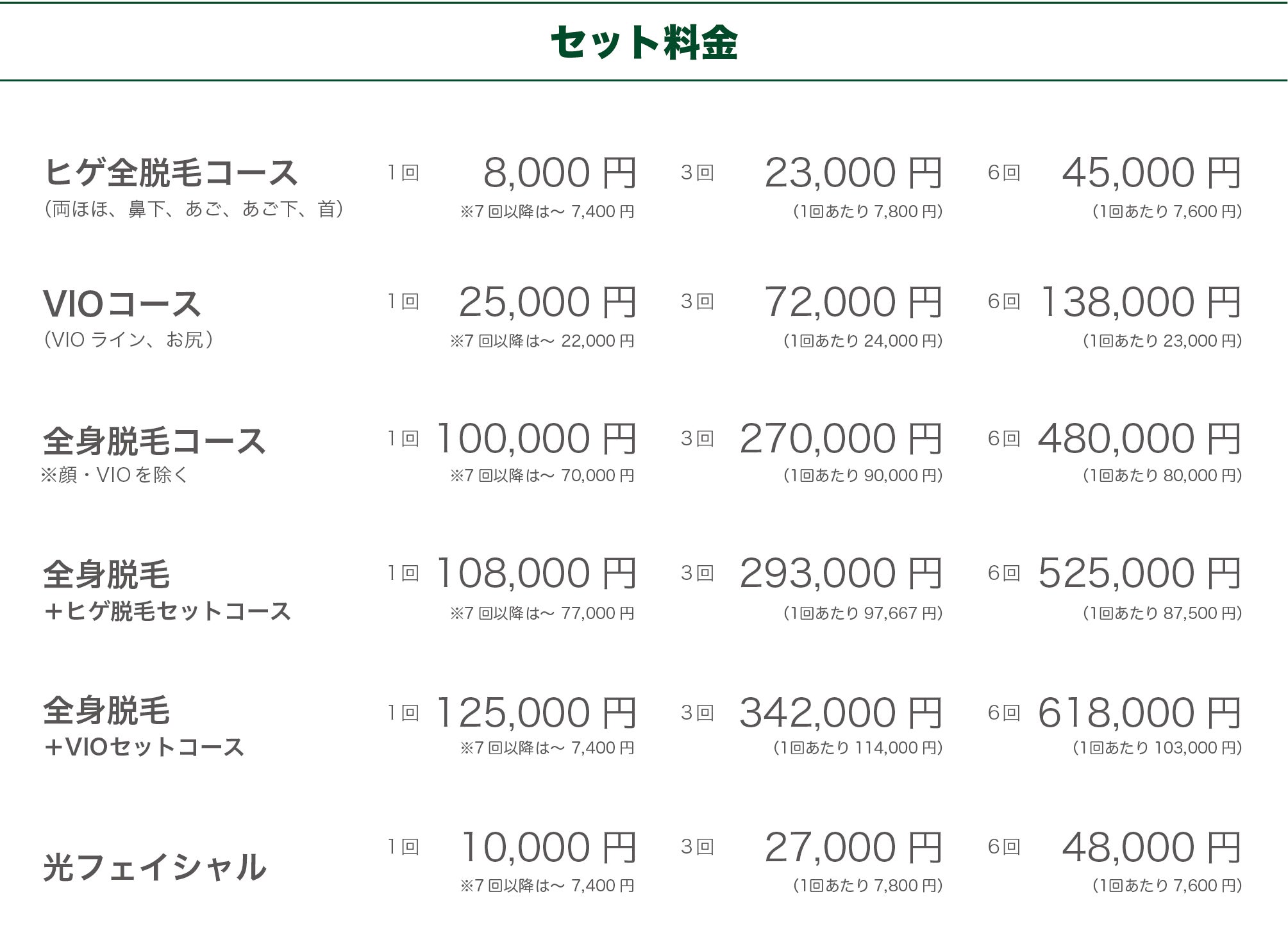 全身を施術面積に応じてパーツごとに分け料金を設定し、各パーツ1ヶ所1回の価格です。3回コース、6回コースは1回あたりの価格が割引されます。またお得なセット料金もご用意しております。