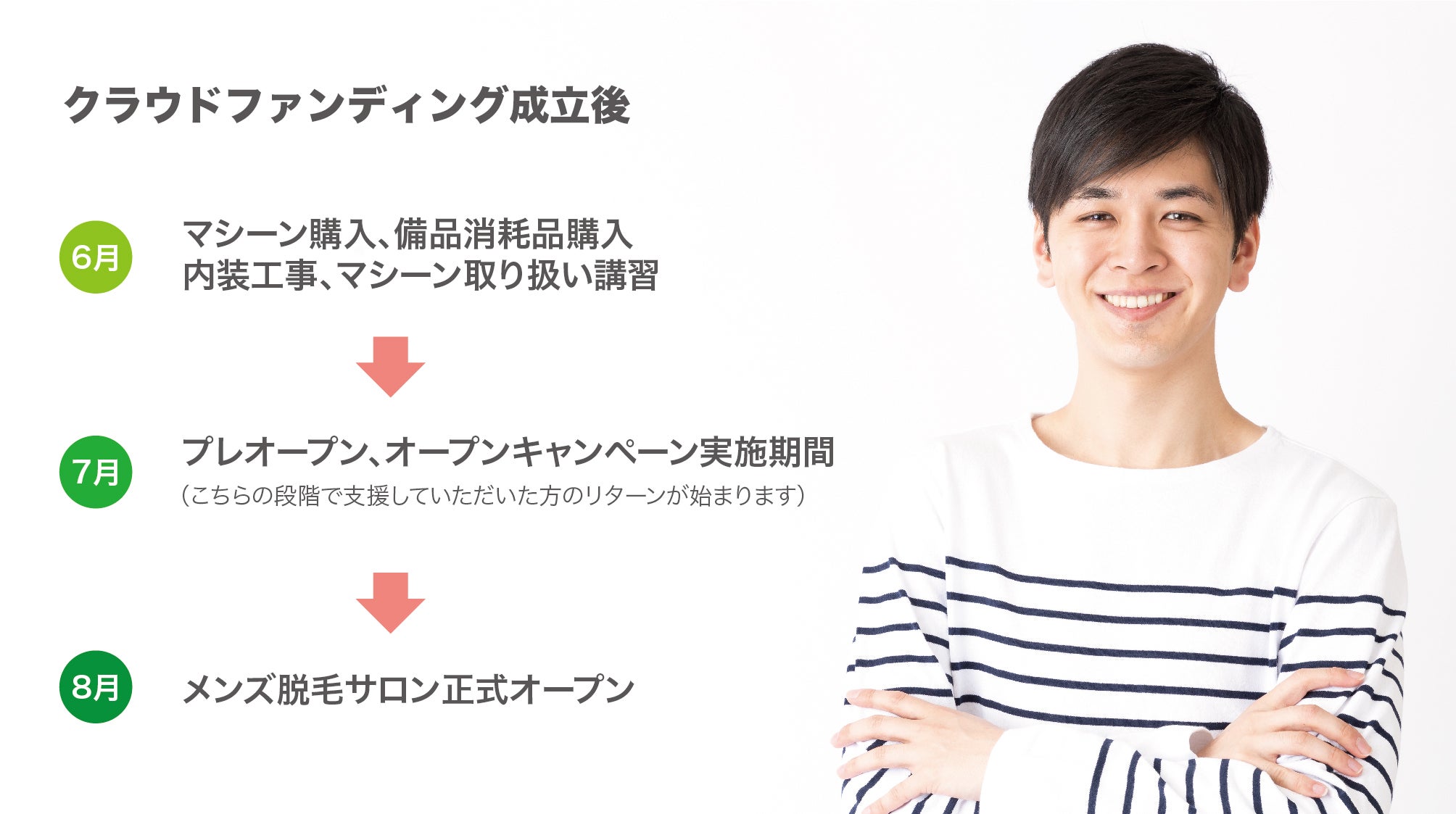 当サロンを利用することで、より多くの方に脱毛という解決策があること、通いやすい脱毛サロンの存在を知ってもらいたいという思いを現実させるために、皆様のご支援・ご協力を、どうぞよろしくお願いいたします。