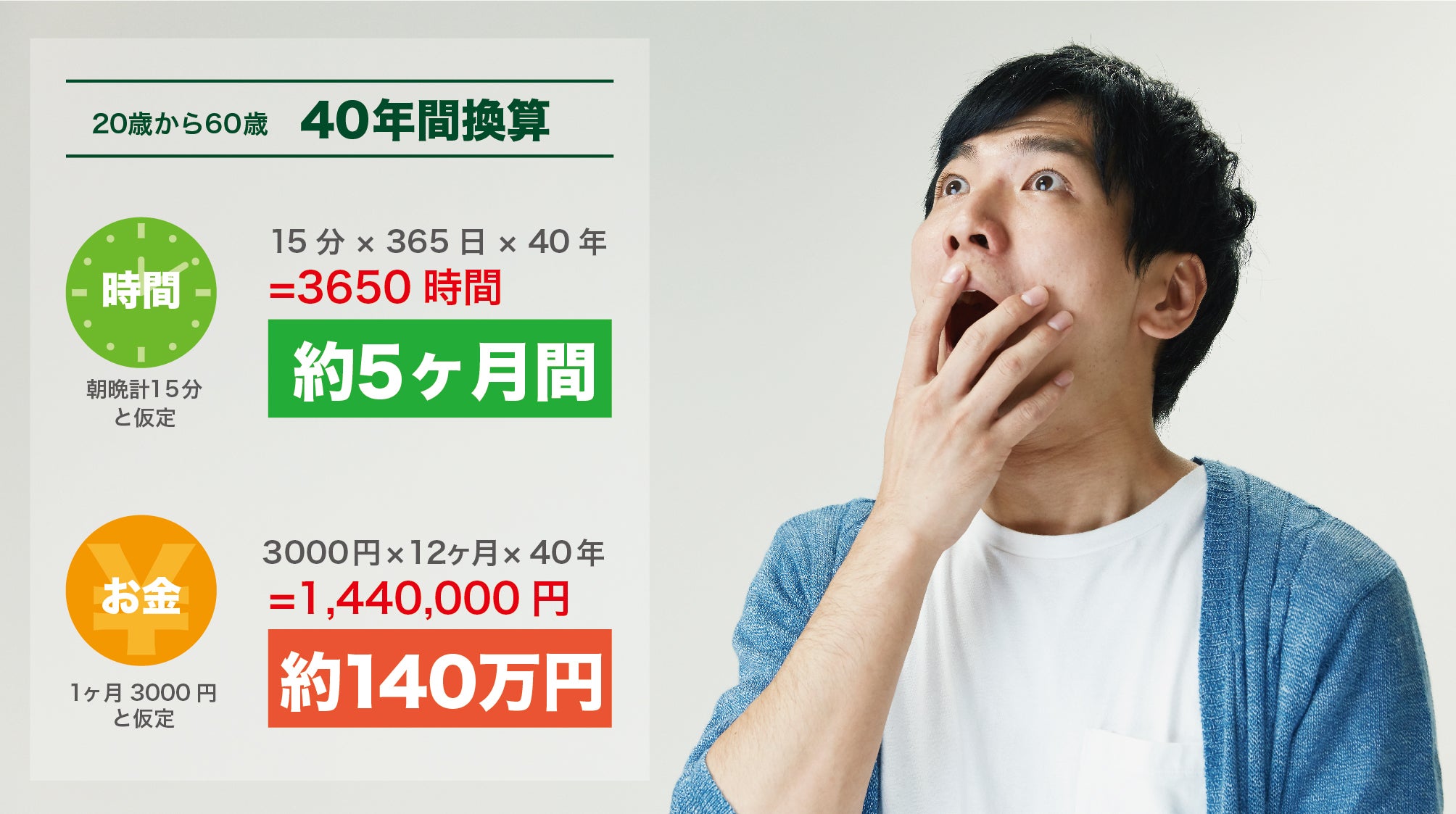 毎月の金額は気にならないほどですが、実はそれが40年分にもなればとんでもない大きな金額をヒゲ剃りに費やしていることになるんです!体毛を処理している方はさらに費用と時間がかかります。