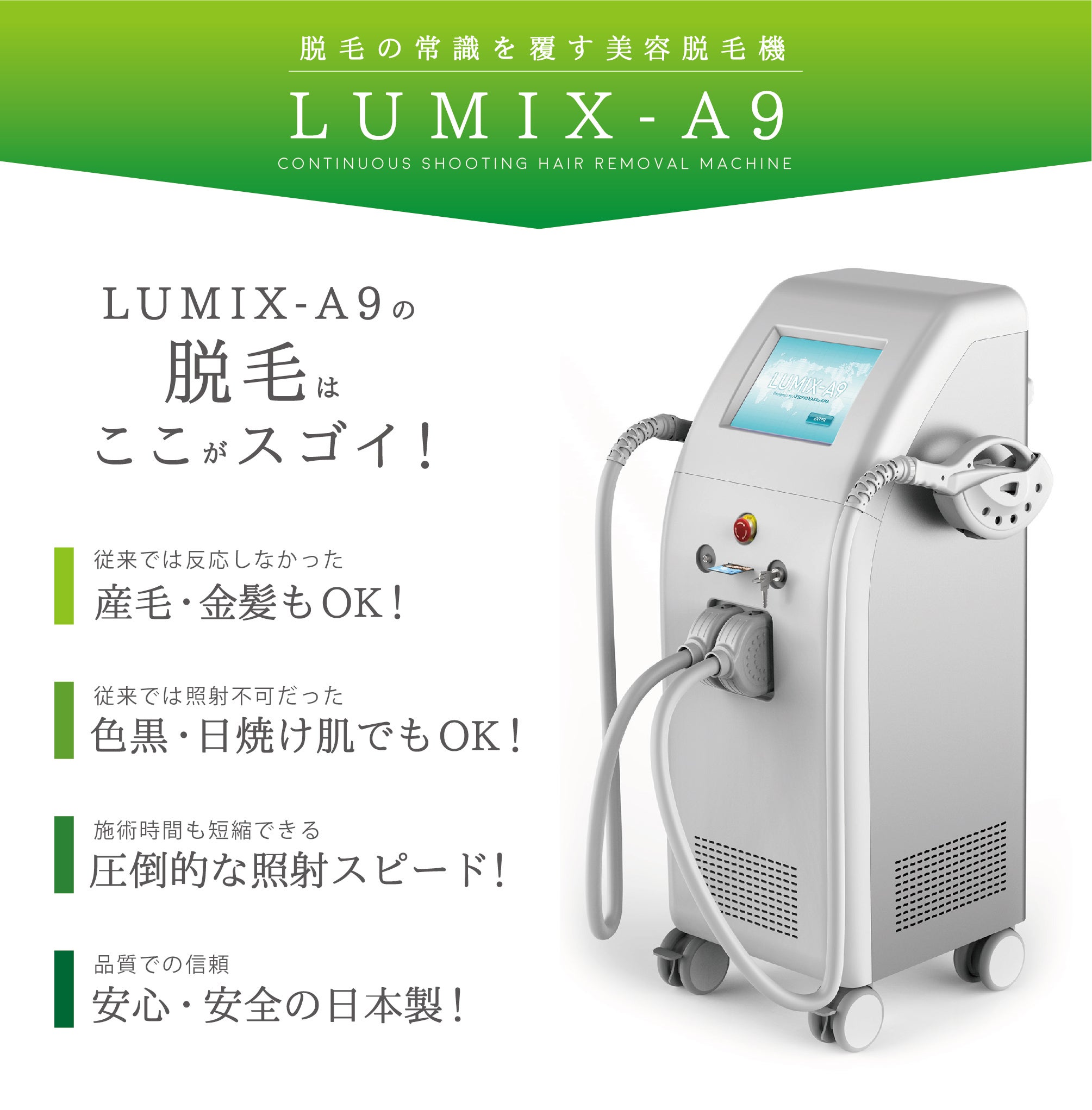脱毛において重要なのはマシーン。導入しようとしている脱毛機は「LUMIX A9」という脱毛機です。