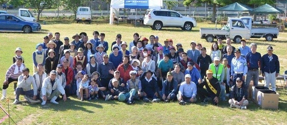 廃校になったグラウンドのバッグネットには、毎年大きなモチーフが作られ市内外、県外からも