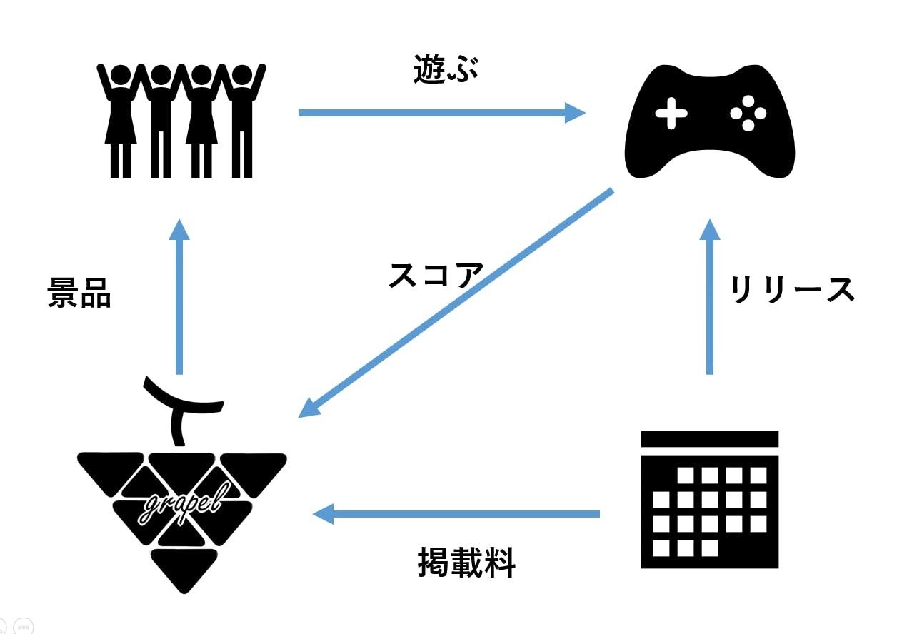 ゲームで遊ぶユーザと、ゲームを提供する企業を繋げます。grapelはその間に入り、サービスの提供をしていきます。最初は独自ゲームの広告からの収益を想定していますが、今後はゲーム会社と提携し、そこから掲載料をもらい運営していく想定です。全国規模に広げられるところまでサービスが拡大してきたら、その段階で広告会社との提携も視野にいれ、さらなる収益アップを目指していきます。