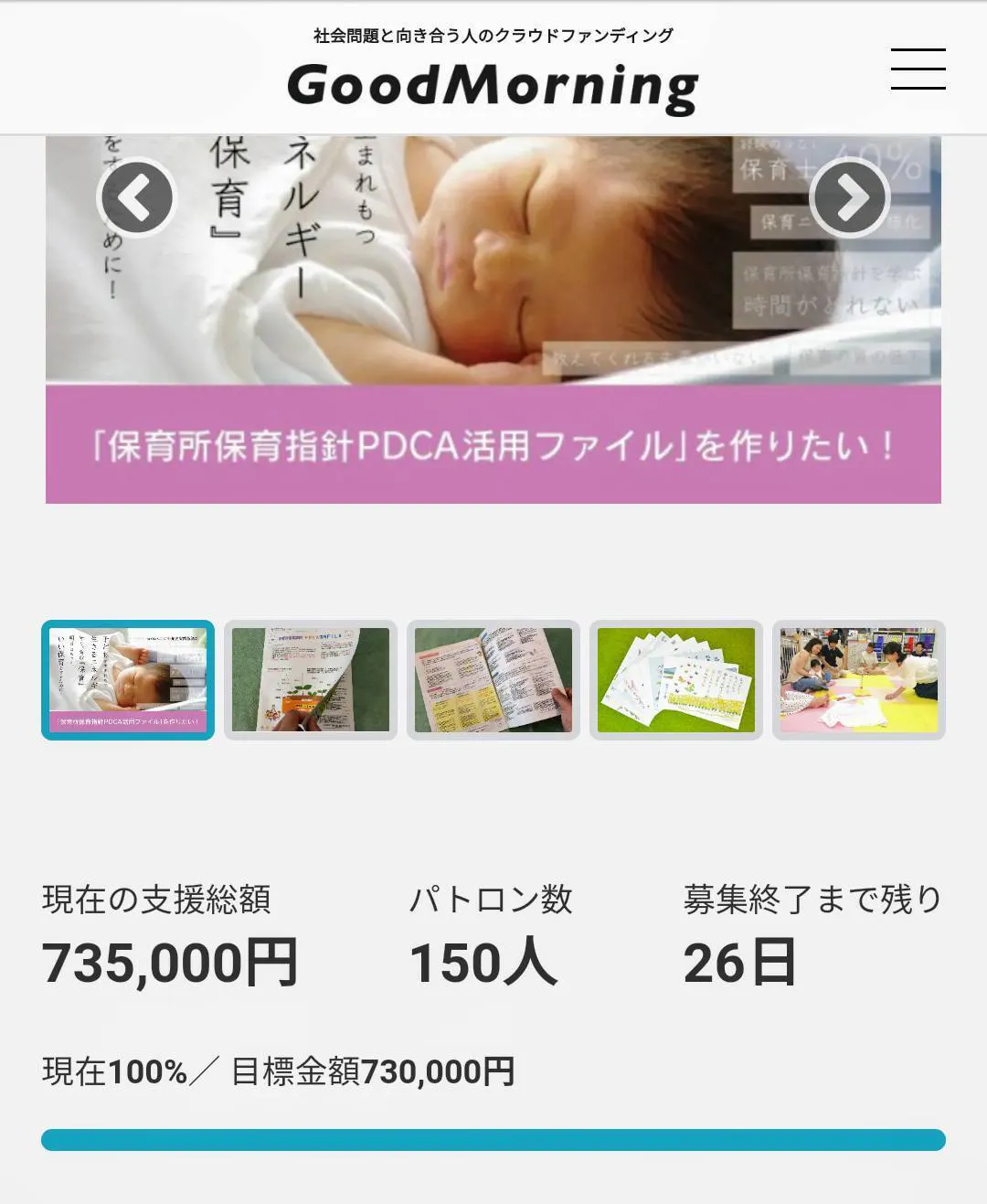2020/01/05 20:37☆感謝☆150人をこえる仲間の輪が広がりました!写真の数字は148名、98%ですが(^o^)追加3,000円リターンもOut Of Stockとなりました。申し込み→決済のタイムラグにより表示数に誤差が生じます。参画申し込み人数は+4名 ☆152名☆沢山の賛同メッセージ情報拡散のプラスの行動『いい保育』を根付かせたい、広めたいその思いが渦を巻くように集まってきています。みなさんの一歩一歩の行動が嬉しいです。☆ありがとうございます☆★さらなる発展を目指して★クラウドファンディングの日にちは、まだ半分以上あります!友だち300人できるかな?チャレンジ!保育士養成校、保育運営法人へ皆さんの思いを届けるために“数の力!パワーアップ!!”にご協力ください。現場の保育者が、主任が、園長が…保育士を目指している人が、いい保育を望んでいる保護者が、300人賛同し、参画して創った『保育所保育指針クリアファイル』という事実に発展させたいです☆私たちの力で養成校での学びや、現場の保育実践での学びに新しい暖かな風を巻き起こしましょう☆皆さんよろしくお願い申し上げます!NPO法人こども発達実践協議会河合 清美 もっと見る