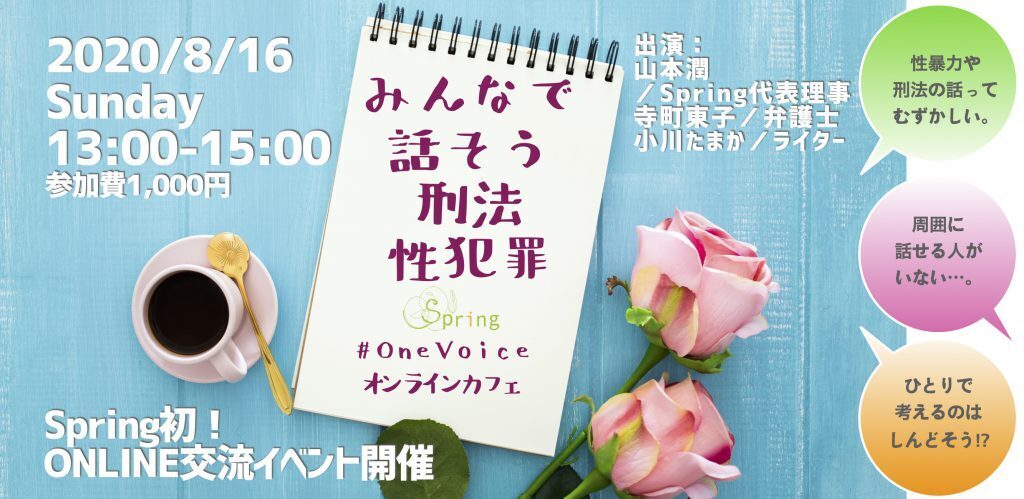 2020/08/02 17:11発行:2020年8月2日======*==========*==========*==========*==========*======このメールは一般社団法人Springが実施したクラウドファンディング「刑法性犯罪改正へのソーシャルアクションで、性暴力被害者が救われる社会を作りたい!」へご支援をいただいたみなさまにお送りしています。======*==========*==========*==========*==========*======先日は、Springが実施しましたクラウドファンディングにご支援をいただきまして、誠にありがとうございます。2020年8月16日(日)13:00~Spring初の試みとなる「オンライン交流イベント」を開催します!ーーーーーーーーーーすべての人の心に、あたたかい春を届けよう。ひとりひとりの声を集めて、性暴力のない未来を作ろう。2020年現在、刑法性犯罪見直しのための検討会がはじまっています。「私たちのことを私たち抜きで決めないで」と訴えてきた Spring の声が、いま、社会を変えつつあります。でも、刑法のことってむずかしくてよくわからない。ひとりで考えるのはしんどい。周囲に話せる人もいないし……。そんな話をよく聞きます。「みんなで話そう刑法性犯罪」はタイトルどおり、刑法について参加者同士、そして Spring スタッフと言葉を交わし、一緒に考え、ひとつの想い、ひとつの言葉をシェアするイベントです。* * * * *本来、このイベントは3月に開催される予定でした。しかし日本全国がコロナ禍に見舞われ、イベントなどでリアルに集まることがむずかしい状況がつづいています。本来なら直接お会いしてお話したいところですが、Spring としては初となる「オンライン交流イベント」を開催する運びとなりました。ご自宅から、安全な場所から、ネット環境さえあれば参加できます。お気軽にご参加ください。ーーーーーーーーー【イベント概要】タイトル:みんなで話そう刑法性犯罪 ~#OneVoiceオンラインカフェ~日 時:8月16日(日)13:00~15:00 ※開場 12:30会 場:zoom※事前にアプリのダウンロード、アカウント取得が必要です。※お申込み後URLをお送りします。参加費:1,000円※クラウドファンディングで「5,000円」「8,000円」のご支援をいただいた方は無料ご招待となります。会場である「HOLDER roppongi」への参加も可能です。別途ご案内をさしあげております。出演者:山本潤(Spring代表理事)、寺町東子(弁護士)、小川たまか(ライター)、司会:三浦ゆえ(Springスタッフ/ライター)※本イベントは、JANICグローバル共生ファンドの助成により開催されます。●受付はこちらから下記のURLからPeatixにアクセスし、必要事項をご記入のうえお申込みください。販売期限: 2020/08/13 18:00:00 ※コンビニ / ATM でのお支払いは、2020/08/12 で締め切られます。https://onevoicecafe0816.peatix.com/●お問い合わせはこちらからevent@spring-voice.org●拡散にご協力くださいチラシをご用意しております。画像のシェアほか、プリントアウトしての配布も可能です。PDFはこちらから:http://spring-voice.org/wp-content/uploads/2020/07/20200816EventFlyer.pdf詳細は随時、本サイトはじめ、Twitter、Facebook、メルマガなどでお届けします。モニター越しとはなりますが、みなさまにお会いできますことをスタッフ一同心から楽しみにしています!!最後までお読みいただき、ありがとうございました。■□■━━━━━━━━━━━━━━━━━━━━━―…‥・・一般社団法人Spring ~性被害当事者が生きやすい社会へ~HP:http://spring-voice.org/Twitter:@harukoi2020Facebook:https://www.facebook.com/Spring20170707/Instagram:https://www.instagram.com/spring_onevoice/メルマガへのご意見・ご要望 → info@spring-voice.orgSpringへの取材・講演依頼 → pr@spring-voice.orgSpringは常時、会員募集! 寄付金募集!詳細は、こちらから。あなたの応援が、私たちの励みになります。・・‥…―━━━━━━━━━━━━━━━━━━━━━■□■ もっと見る【プロジェクトSUCCESS御礼】