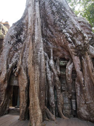 2015/06/23 11:49ガジュマルの木に呑み込まれそうな遺跡です。 ガジュマルは低木等を土台にして発芽し、たくさんの気根を垂らして生育し、土台となった木を中に包み込んでいきます。中に包み込まれてしまった木はやがて枯れてしまいます。 そのことから別名「絞め殺しの木」とも呼ばれています。 シェムリアップのアンコール遺跡はクメール王朝時代の遺跡群で、クメール王朝の首都の跡です。アンコールワットを中心に40余りの遺跡が点在しています。 中にはガジュマルの木に破壊されたものもあり、さまざまな国の調査団が遺跡の調査復興に取り組んでいます。 もっと見る