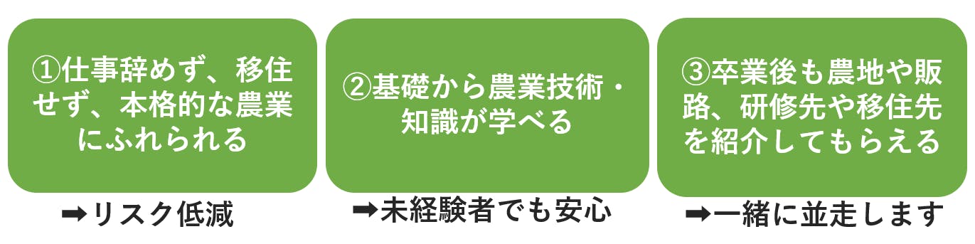 基礎的な農業技術を身につけたり、実際に体験して自分が本当に農業をできるのかを考えてみることや、就農に関するノウハウを知ることができたり、つまづいたときに頼れる存在ができれば、リスクは低くなり、農業に挑戦してみよう!農業を続けてみよう!という人材も増えてくるでしょう。