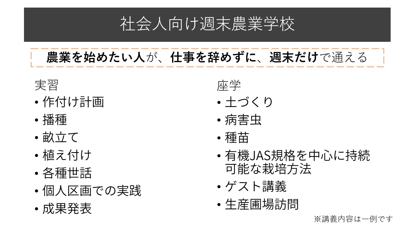 社会人向け週末農業学校では、週末だけで基本的な農業技術が学べます。座学講義で農業知識をつけ、畑での実習で実際の現象を確認します。また、畑に専用の個人区画を設けて、学んだことを各々実践します。休んだ際も講義動画をご自宅等で見られるようにし、忙しい社会人でも通いやすい制度も用意する予定です。
