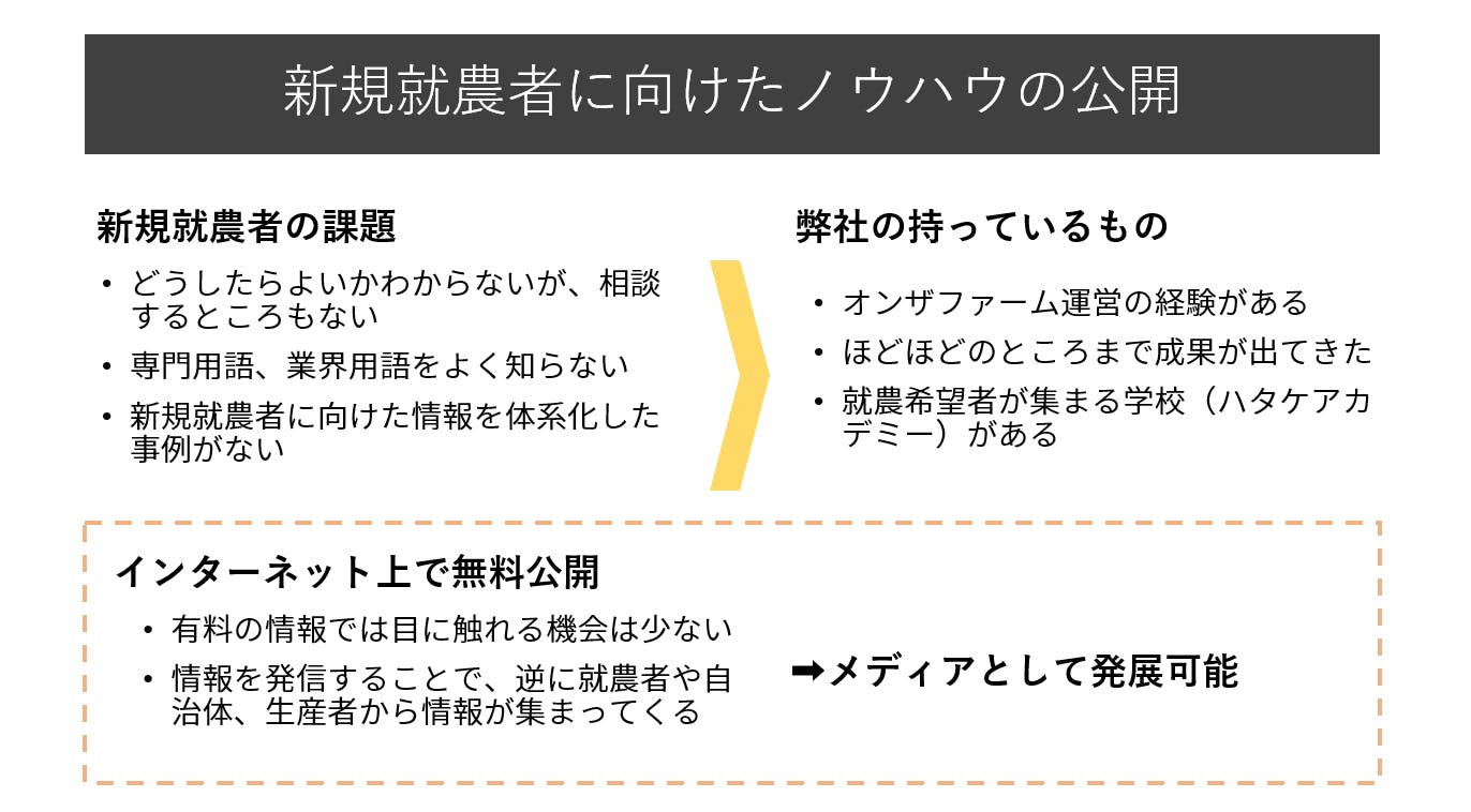ウェブサイトでは、農地や販路の確保、行政の就農支援の事例など、農業技術以外の就農にまつわるノウハウを無料で公開していき、全国の就農希望者のサポートをしていきます。
