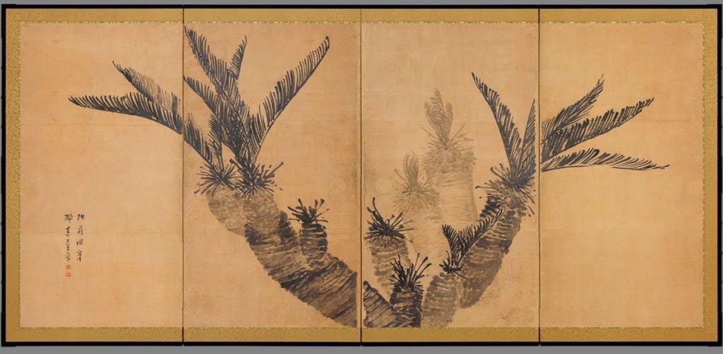 また、俳人画家の与謝蕪村(当時51歳)が、明和3年(1766)から同5年の春先まで高松・丸亀・琴平の俳友にお世話になりながら、妙法寺に逗留しました。その際、客殿や仏間の襖絵などを描き、寺宝として大切に保存されて今日に至ります。このようなゆかりで妙法寺は別名「蕪村寺・ぶそんでら」と呼ばれ、大作の『蘇鉄図』(=写真)や『寒山拾得図』(かんざんじっとくず)といった6作品が国の重要文化財に指定されています。