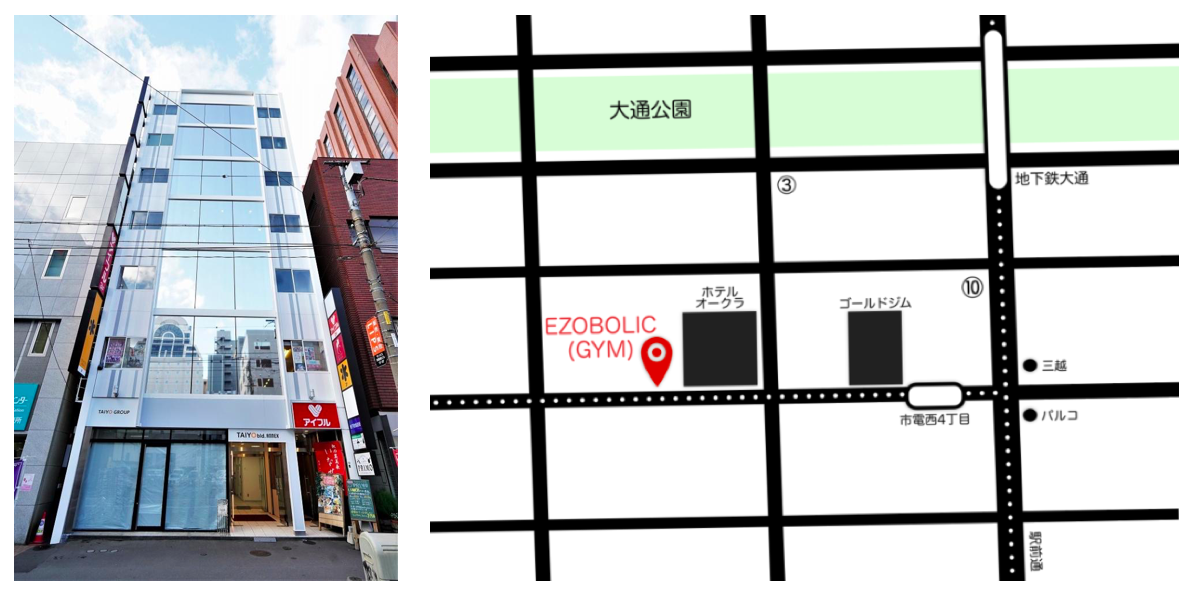 サプリメントショップEZOBOLIC大通店の隣がGYMエリアとなります。