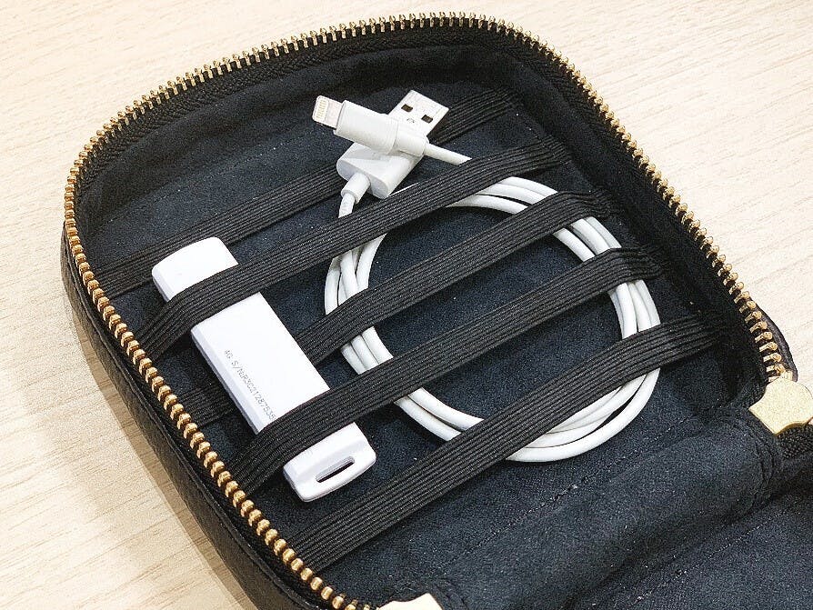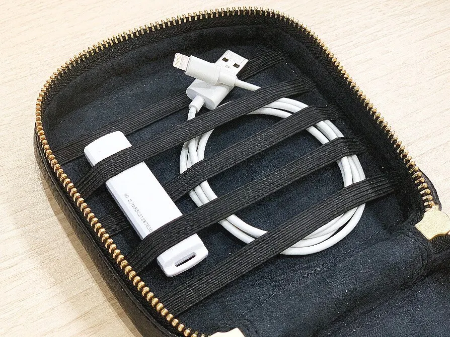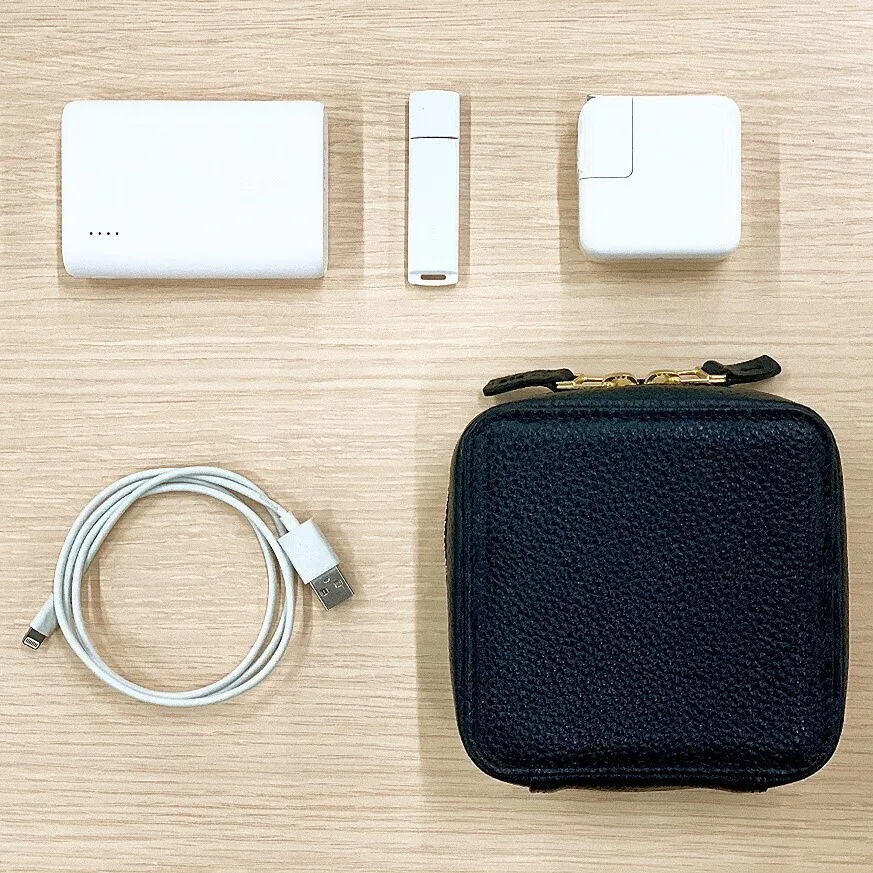スマホ世代の必須アイテムであるモバイルバッテリーとコードを一緒に入れておく