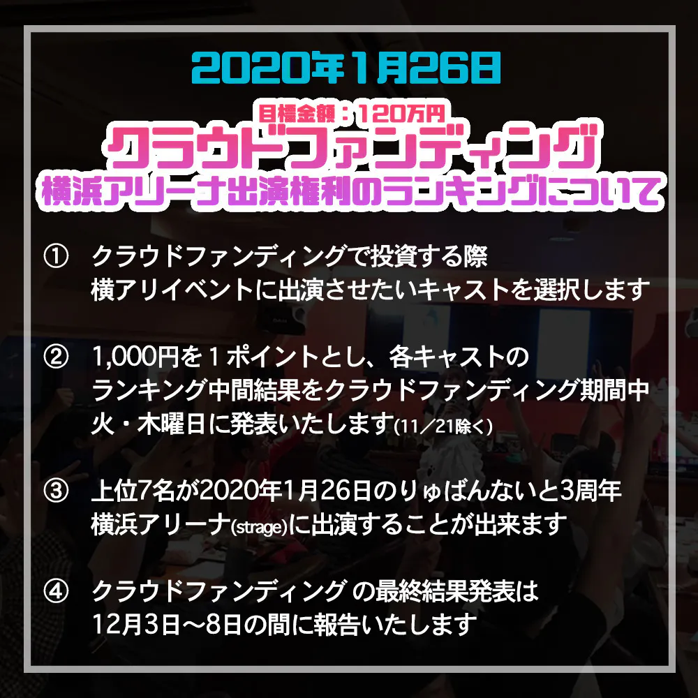 そこでクラウドファンディングを通してこの横浜アリーナでイベントをするという夢を叶えたいと思いクラウドファンディングのプロジェクトを立ち上げました!