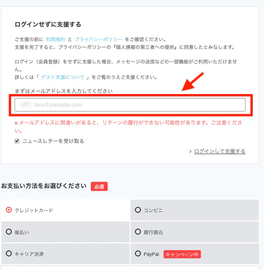 またアカウントを登録しなくてもメールアドレスさえあれば支援可能です。リターンコースを選んでメールアドレスを入力し決済をお願いいたします。CAMPFIREはクレジットカード払い・コンビニ支払いや銀行振込、キャリア決済などから選べます。