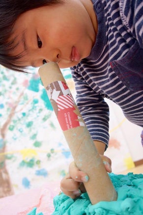 写真の男の子もダンボールの筒で粘土を伸ばし始めた後、