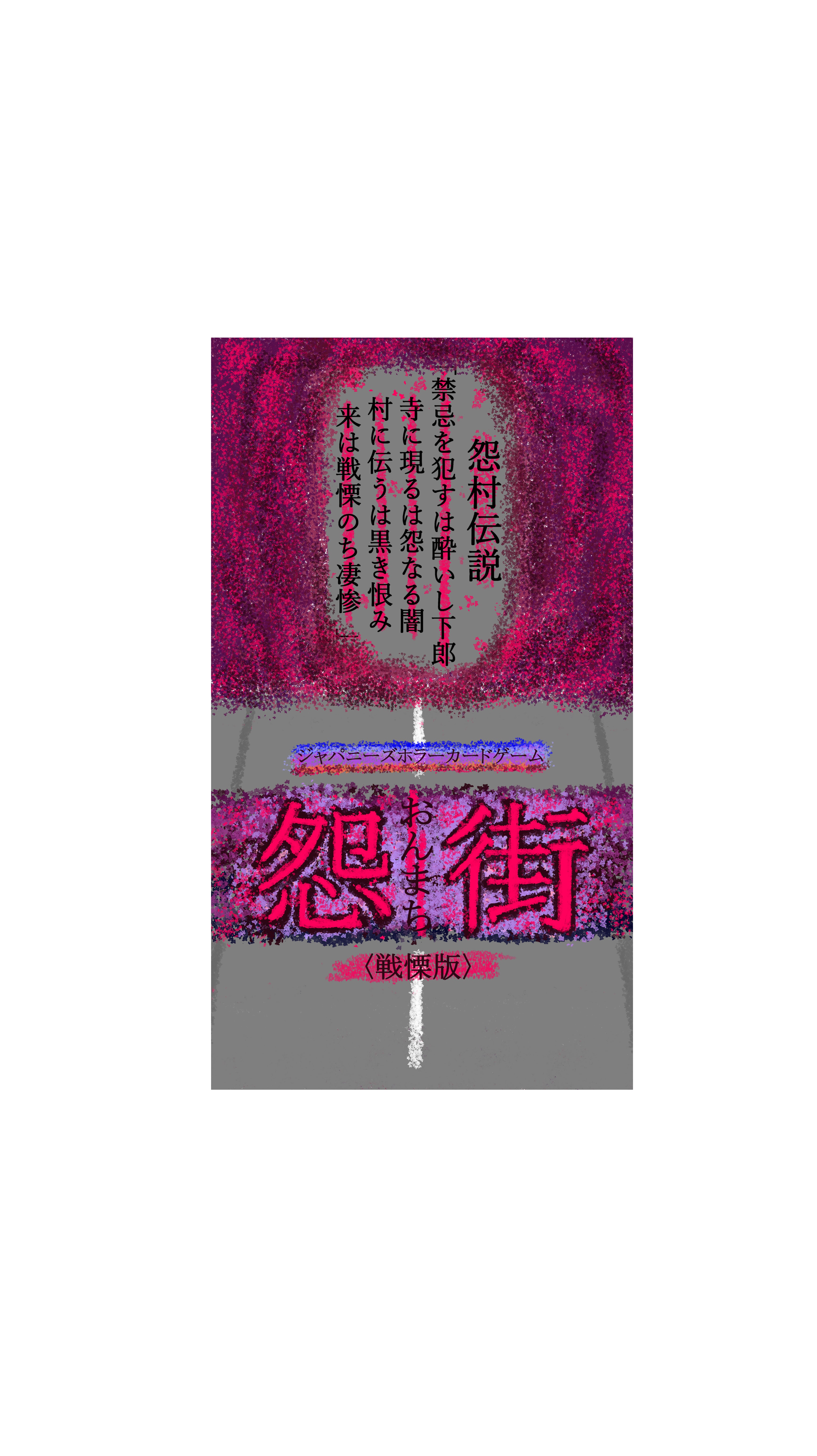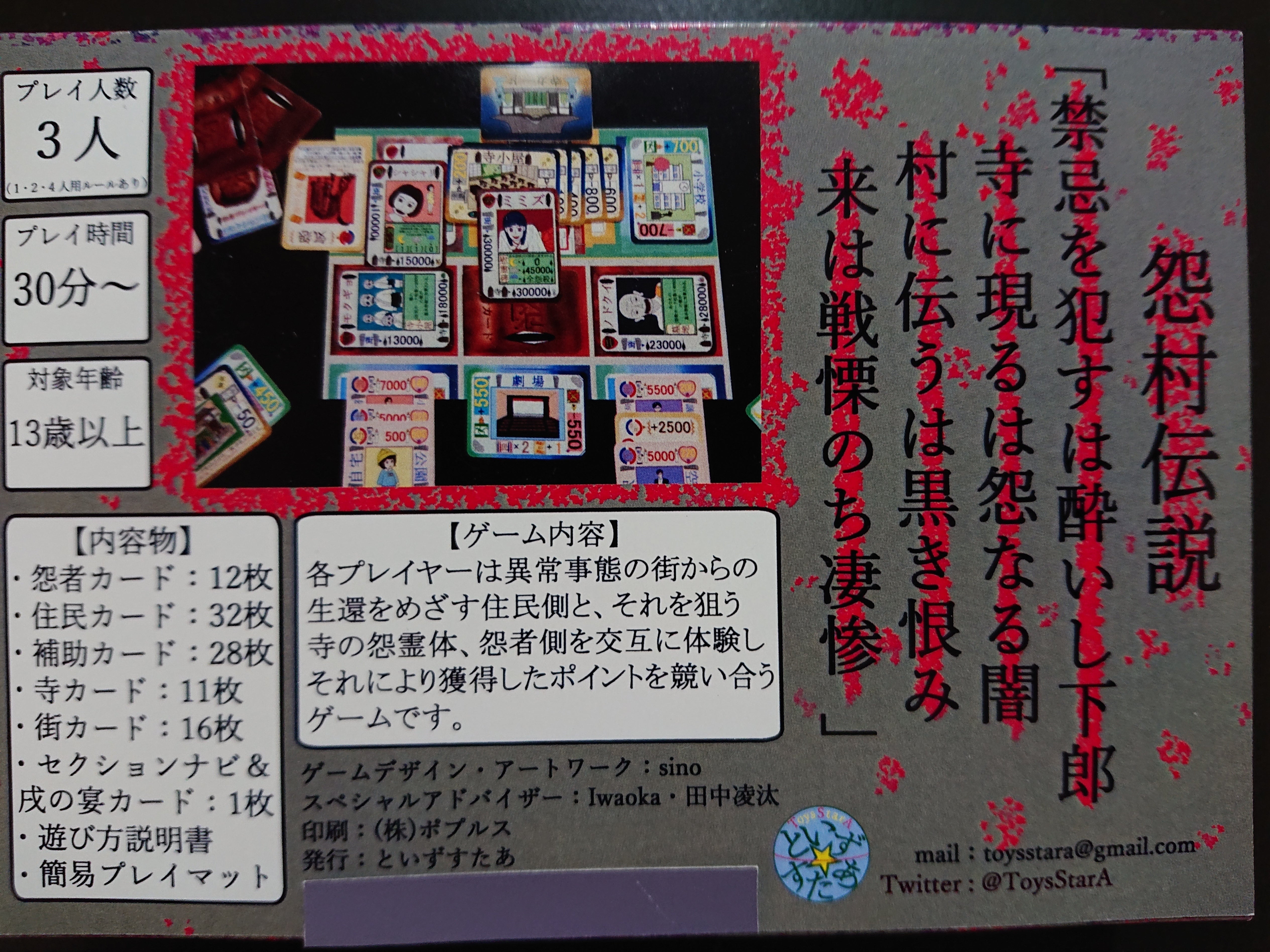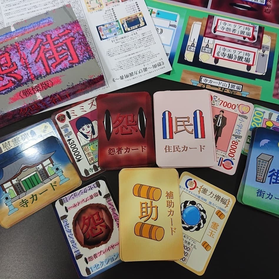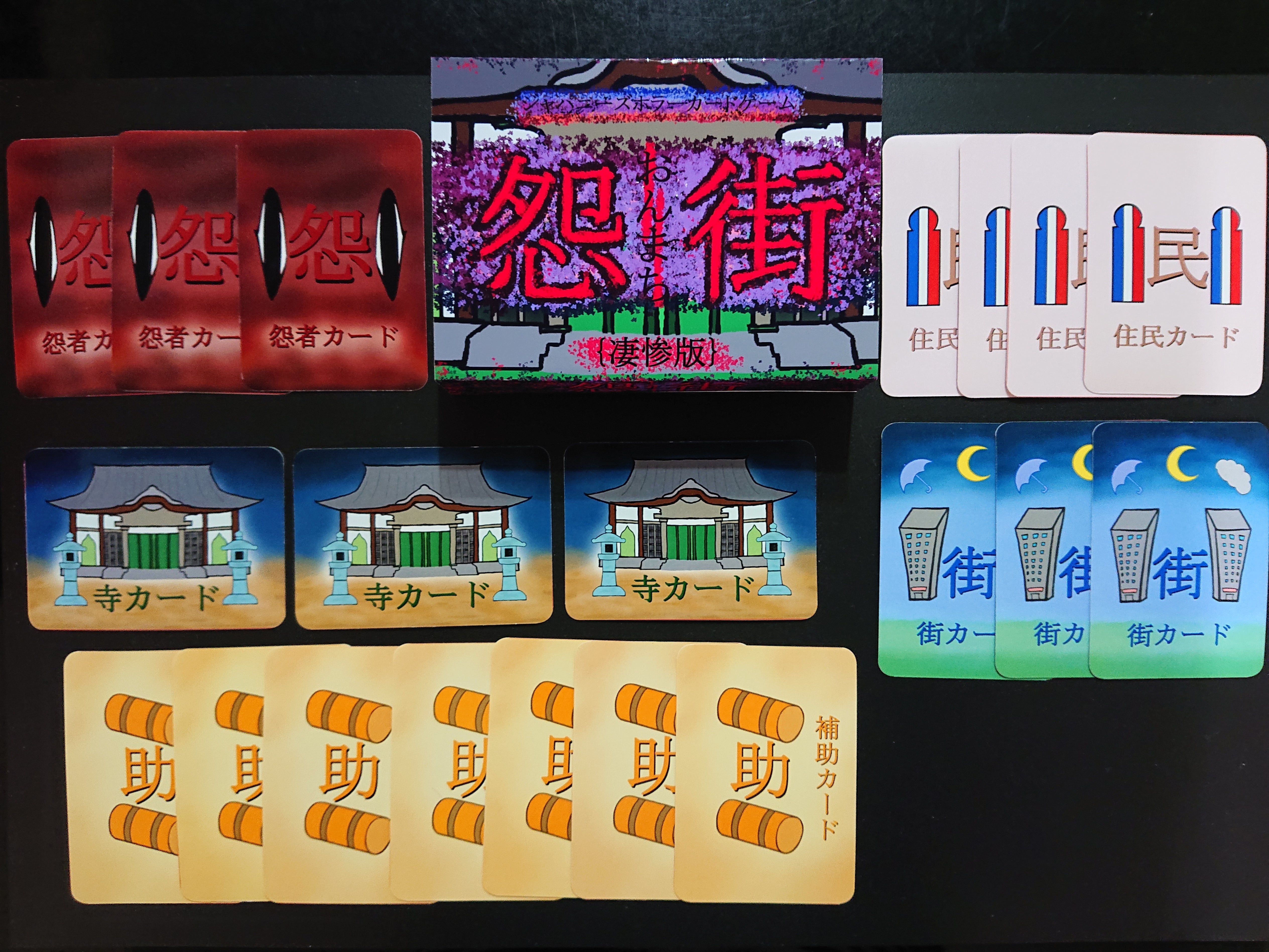ジャパニーズホラーカードゲーム「怨街(戦慄版)」は3人プレイがメイン(1・2・、4人用ルールあり)(対象年齢13才以上)(3人プレイ時、1ゲーム30分程度)の100種のカードからなるアナログカードゲームです。