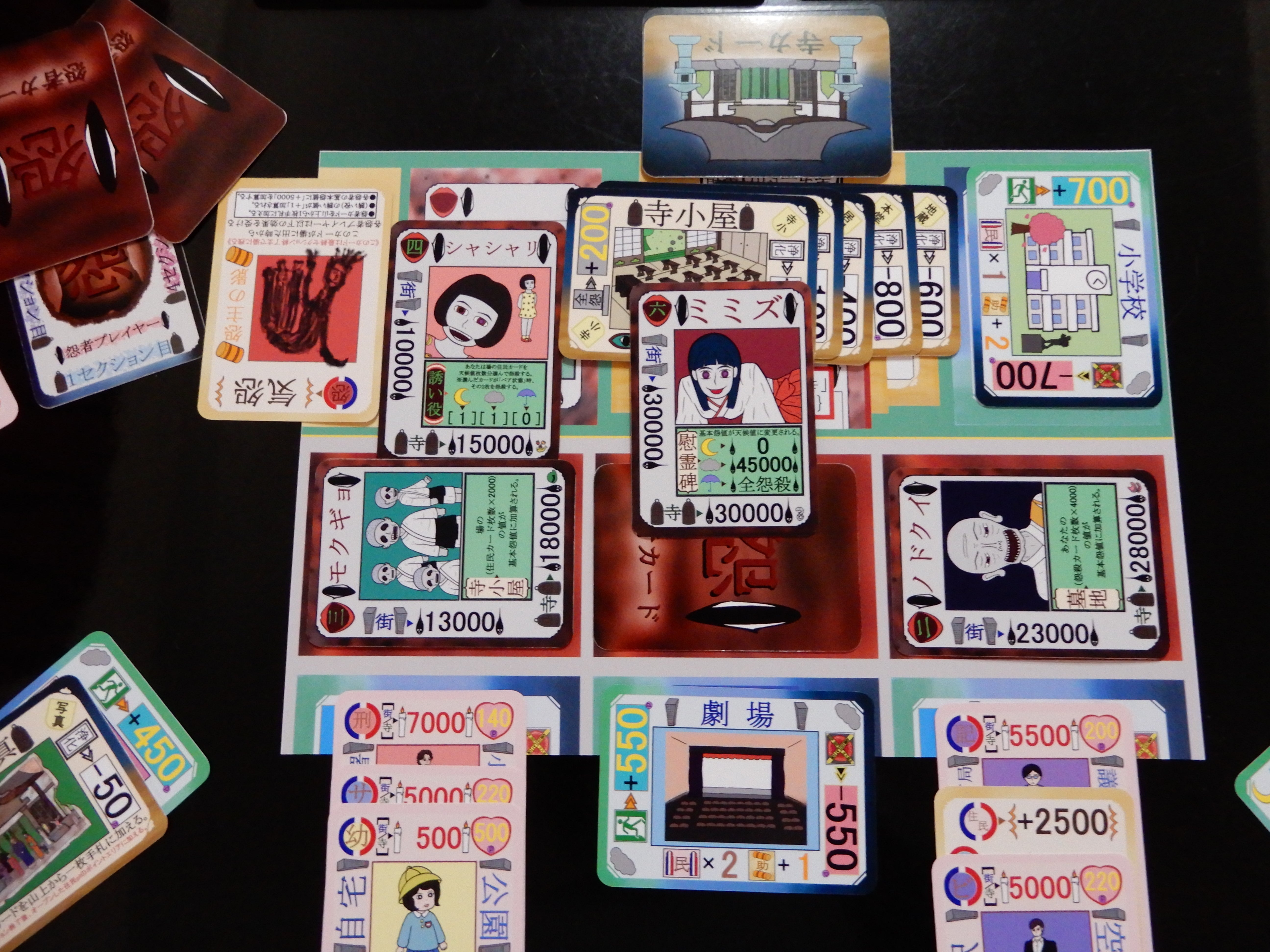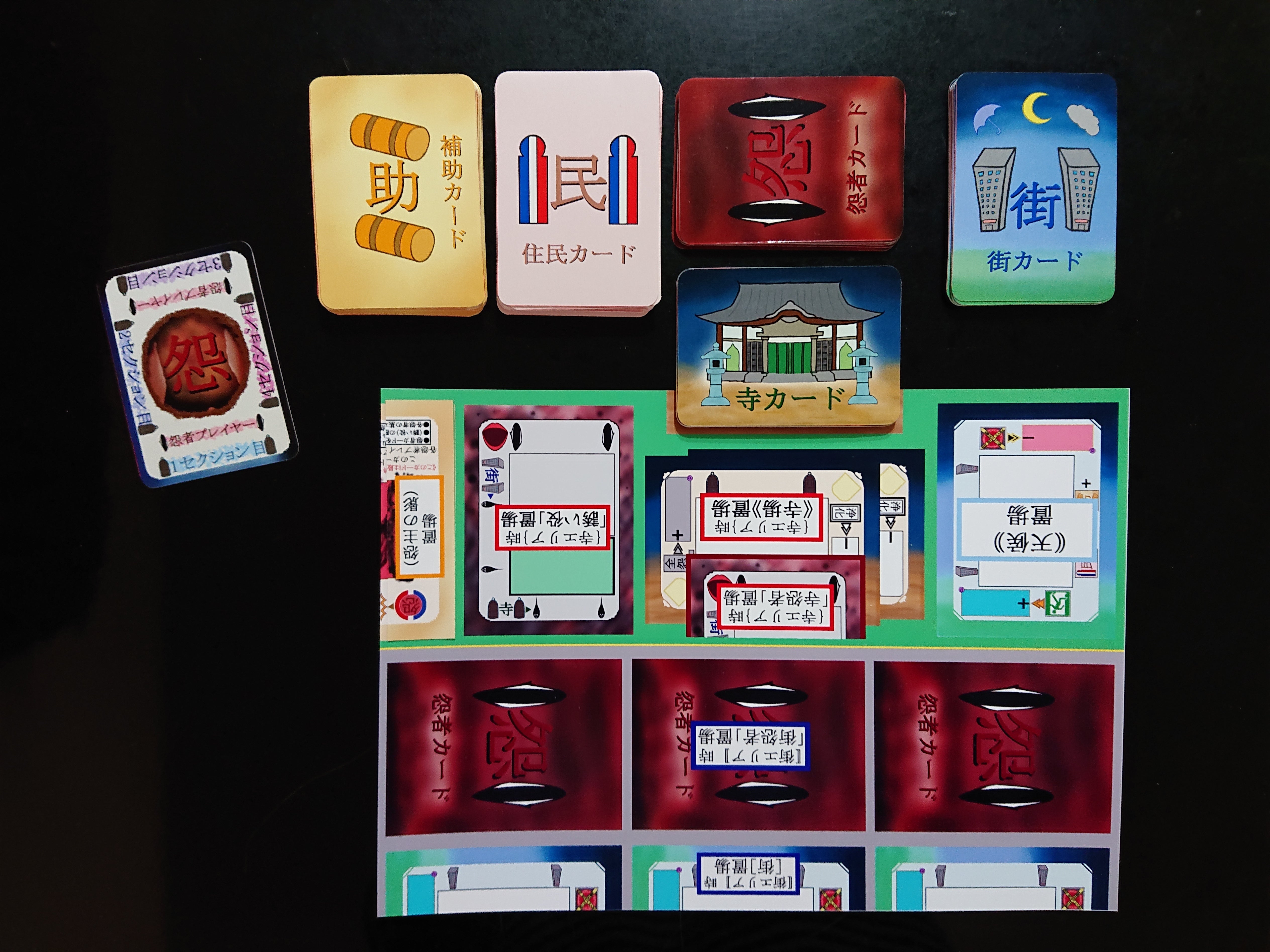 遊び方は比較的シンプルで、プレイヤーの1人は「怨者役」となりランダムに手札に配られた5枚の「怨者カード」の強さや能力を見極め、そのうちの3枚を「街怨者」として各街場に伏せた状態で潜ませ、残りの2枚は寺での「誘い役」と「寺怨者」として手札に残し、住民役を待ち受けます。