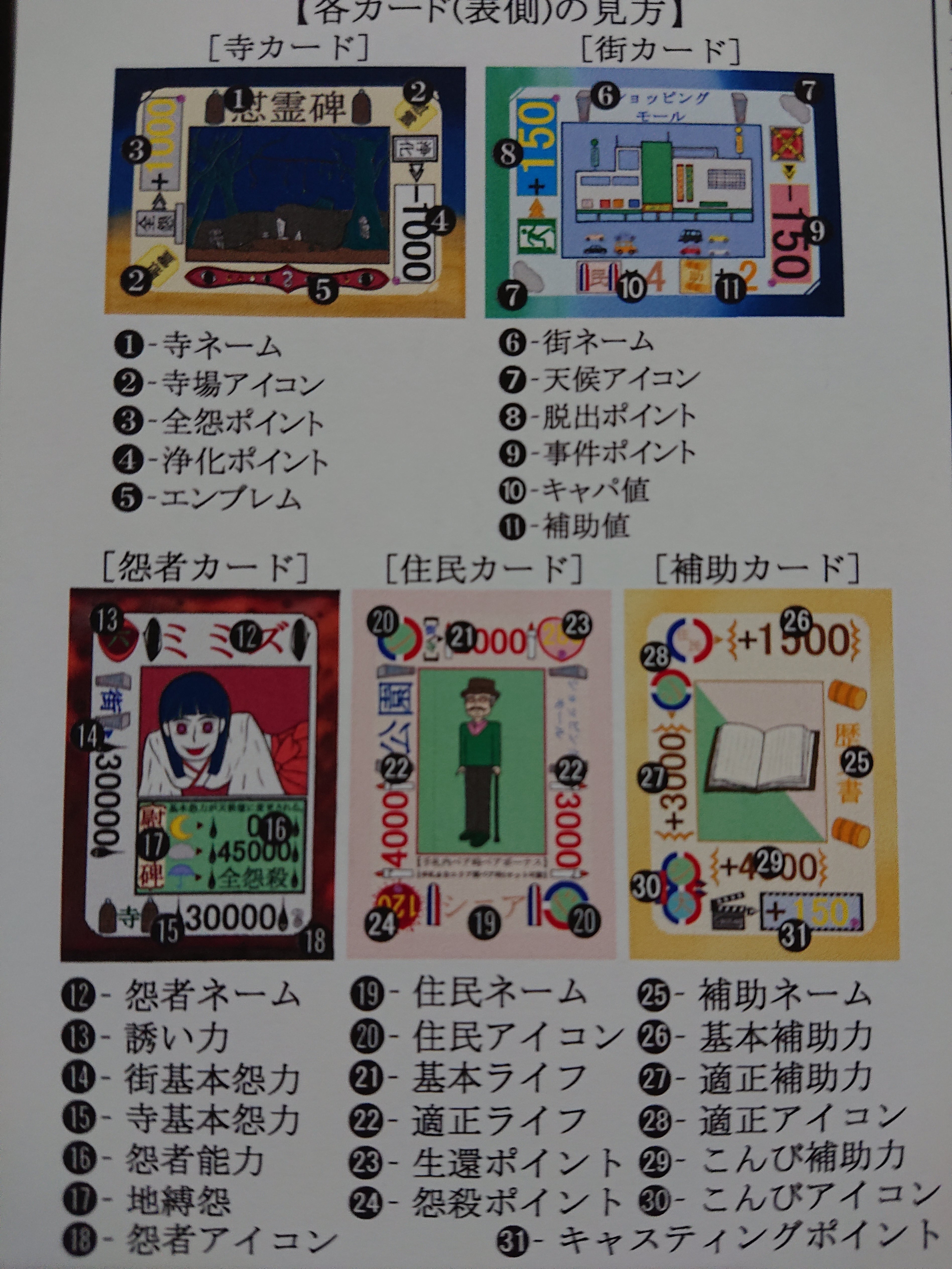 「寺」に誘われた各「住民役」はそれぞれの場に残った住民カードや補助カード、また手札のカードも伏せた状態で場に配置して怨者役にプレッシャーをかけつつ、「寺怨者」と対峙時にこれらのカードの力をすべてひとつの値に合算して「結束値」とし、寺からの生還を目指します。