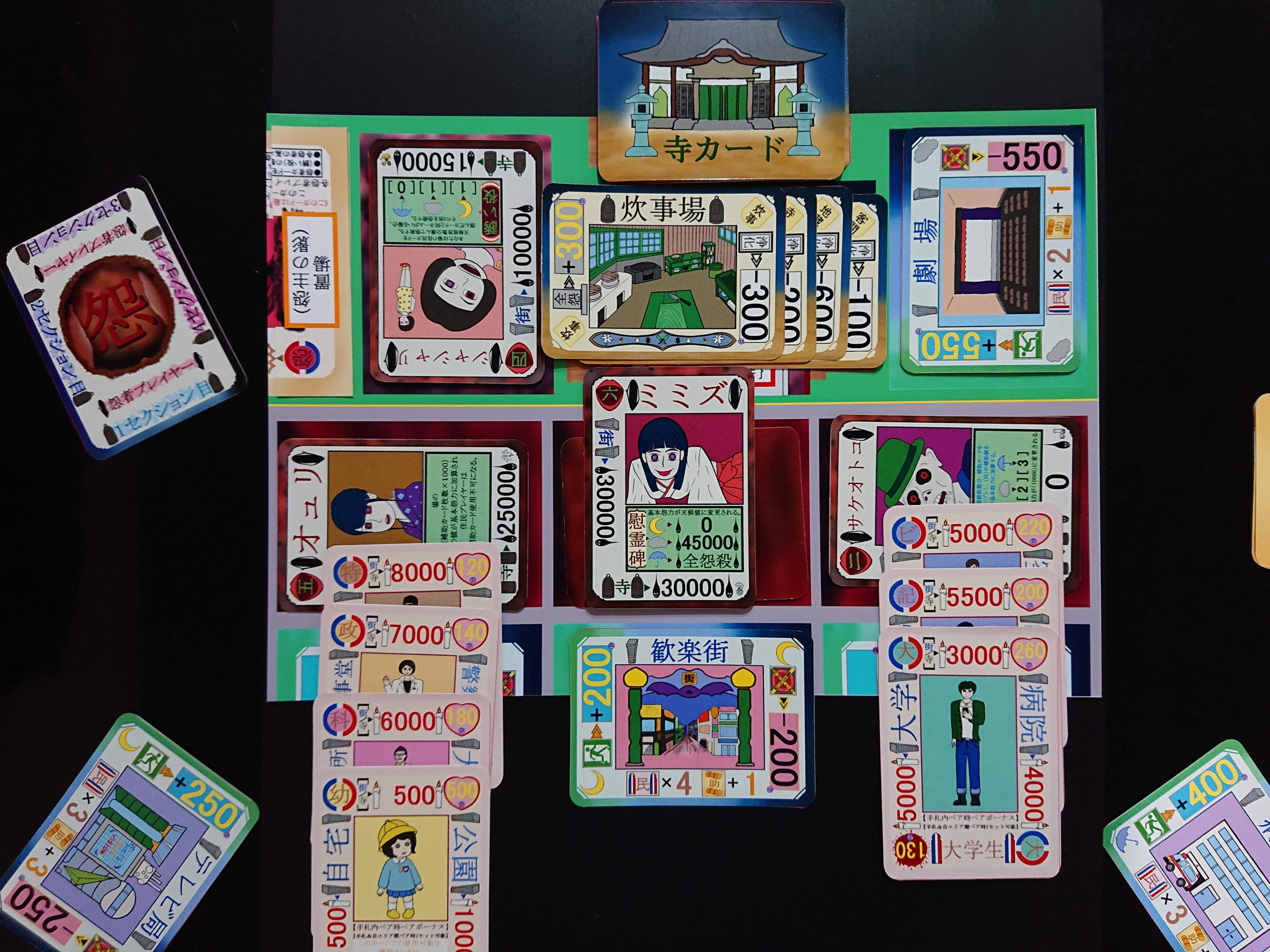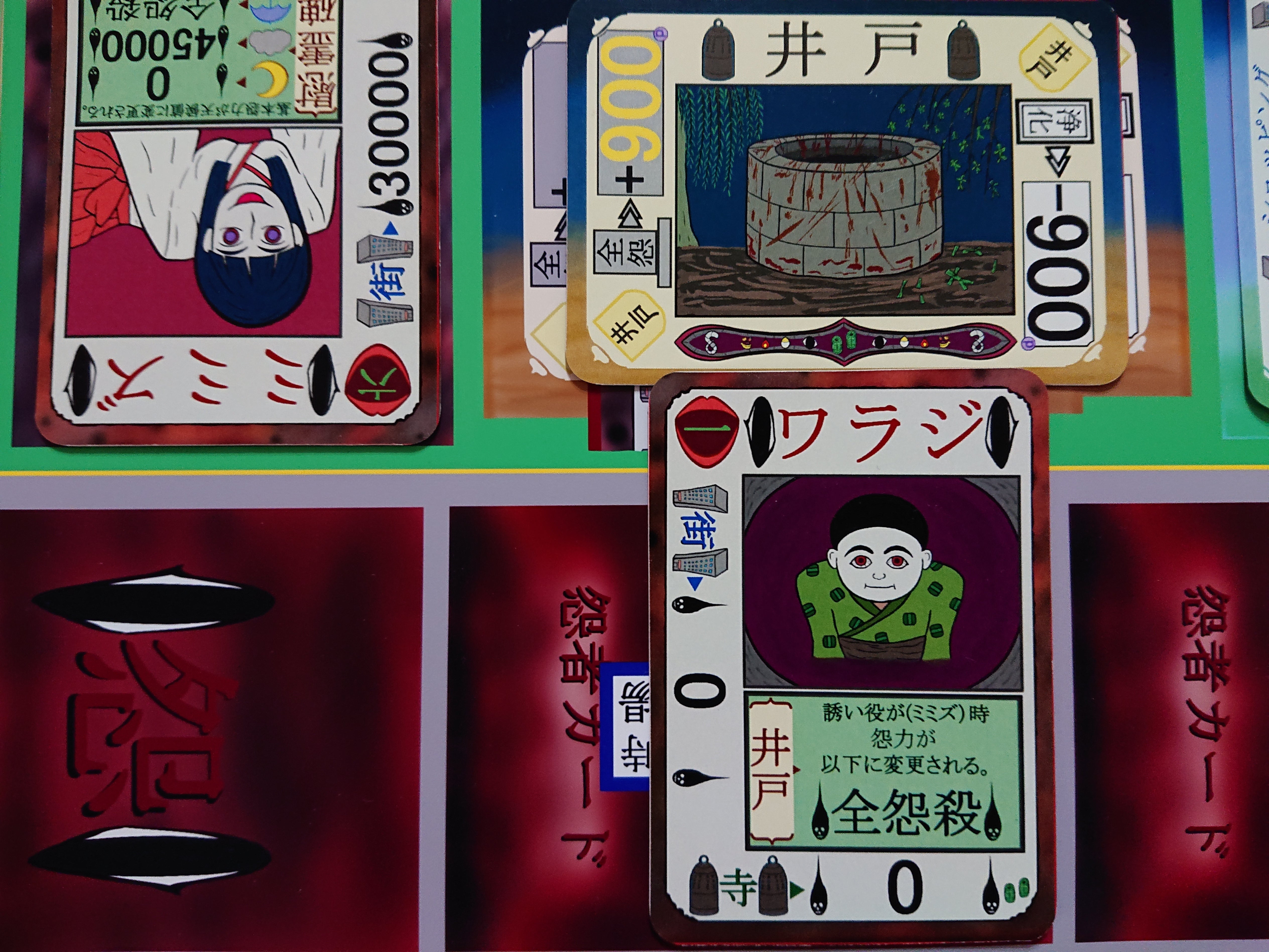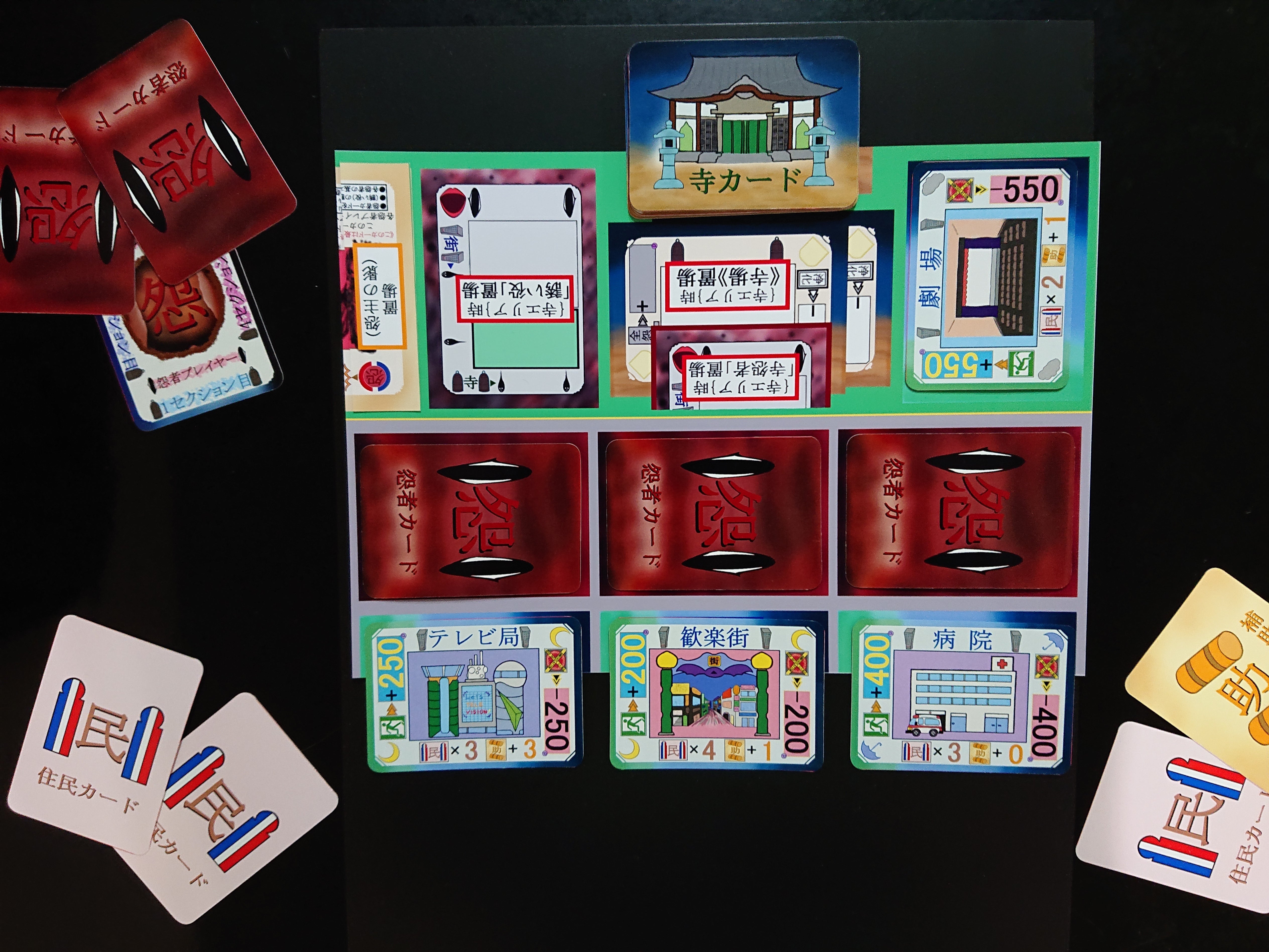 これに対し「怨者役」は結束した住民達のすべての命を獲るべく、「誘い役の誘い力」を使って「寺カード置場」から寺カードを各「住民役」に1枚ずつ交互にめくらせて「寺場置場」に配置させ、怨者役はその都度その「寺場」で「寺怨者」を出現させるか、残りの「誘い力」を使って次の寺カードをめくらせるか判断を下します。そうして任意の寺場に寺怨者を出現させた後、住民の「結束値」と寺怨者の「寺怨力」を比べ合います。